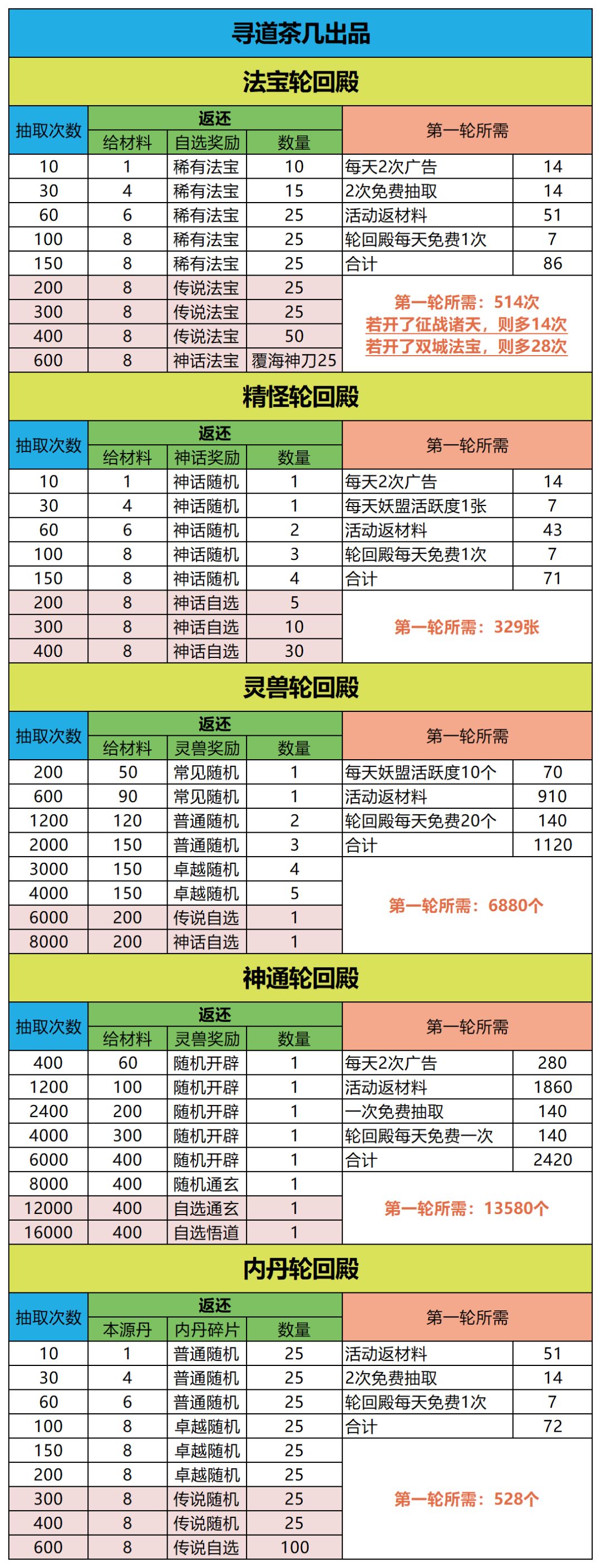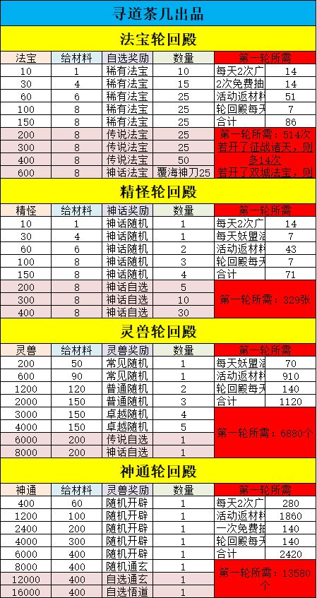 小师妹收到了来自狐岐山6服的道友[🌕上玄]关于《轮回殿资源分配》的投稿。道友们快来看看 轮回殿是中后期,平民获取稀有资源的关键活动, 不少小伙伴对屯多少资源多有疑惑, 所以这里出了这份攻略。 轮回殿目前有5种: 仙玉、精怪、神通、灵兽、法宝。 仙玉轮回只有开服第一轮, 法宝轮回,贫民做不了一点, 所以这里只统计了三种 适合平民做的轮回殿所需资源。 轮回殿精怪 精怪轮回:400一轮,800二轮,12