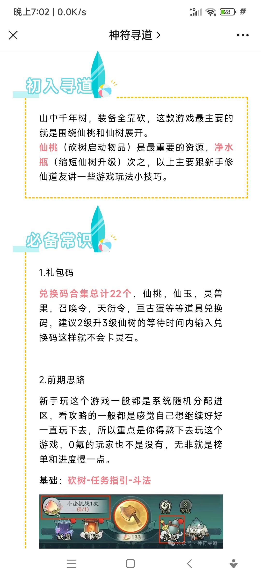 我玩了四个小号了,总结出一套经验,分享给大家,零氪玩家 1、开局,跟着先把礼包码领了(在论坛里有),然后直接升级仙树,第一次升级5分钟就可以了,没必要用加速,接下来就按着任务走 2、仙树:开局升到2级之后,然后升3级,这时候就有加速了,直接用;升4级时用看广告,但是现在没广告就直接花50个玉石买半小时加速,很赚,接下来的5级之后的就按部就班,不要买太多加速,尽量打出来,差个5个左右仙瓶就可以考虑买