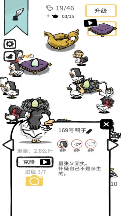 这是一款轻松有趣的休闲益智游戏,孵化出尽可能多的稀奇古怪的鸭子!随着孵化,鸭子的数量会不断增多,鸭子也会开始发生基因变异!随着一代一代地孵化,变异的鸭子也会不断出现!你将看到巨大的鸭子、拥有奇怪翅膀的鸭子,还有各类疯狂的鸭子!想要一些惊喜吗?将孵化出的鸭子丢进洞里,看看会发生什么?