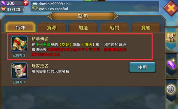 相信各位领主大大刚开始接触王国的时候都是想和朋友一起玩的,但有时候你们又在不同国家,怎么办呢?! 这个时候,有个神奇的道具就派上用场了!-----新手传送!领主大大们一开始登陆游戏都会获得“新手传送”道具,千万不要小看这个道具,他除了可以传送至指定地点外,还可以传送至其他王国!目前各个国家各个联盟都在招兵买马,爱耍的你们肯定会找一个契合的联盟一起成长,抵御外敌!但这个时候如果盟友都在不同国家就