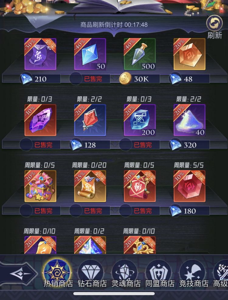 #第七幻域攻略征集 《第七幻域》商店0氪可选择购买的东西,下面都显示出来了: (1)日常商店:请看---》已售完 (2)同盟商店:钥匙、木头、水晶、月夜见尊碎片、攻击宝石、血量宝石 (3)竞技场商店:就美杜莎的碎片,不贴了 (4)高级商店:就白票,也不贴了 (5)荣耀商店:先兑奥丁碎片,有富余的话兑黑曜石,对付4天一周期的那个升级活动。 (6)深渊商店:自选神器 (7)符文商店:喜欢哪个买哪个 先
