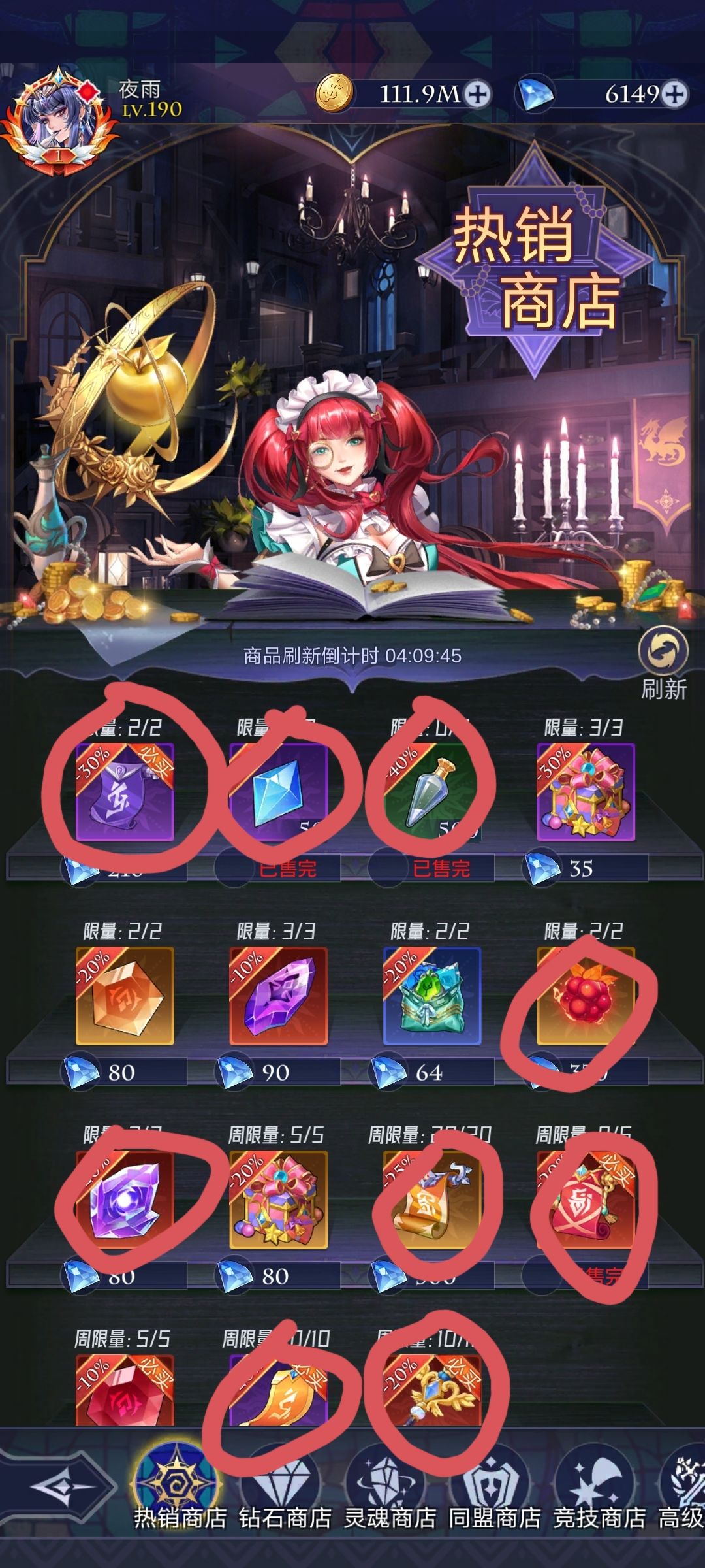 首先说明,本人先锋服老登,但还不是顶尖的那种,所以不要惊讶我的等级[表情_微笑] 热销商店 前七天因为有返利,钻石可买紫色召唤卷,龙血果实,御灵。金币可买的拉满,周限购拉满。 推荐钻少的只刷新一次,钻石多的量力而行。[表情_斜眼笑] 钻石商店 无推荐,角色好感度上限时可买戒指。 灵魂商店 无推荐,想买就买画圈的那个,另一个道具要ur满星之后再次获得才有,早着呢[表情_斜眼笑] 同盟商店 优