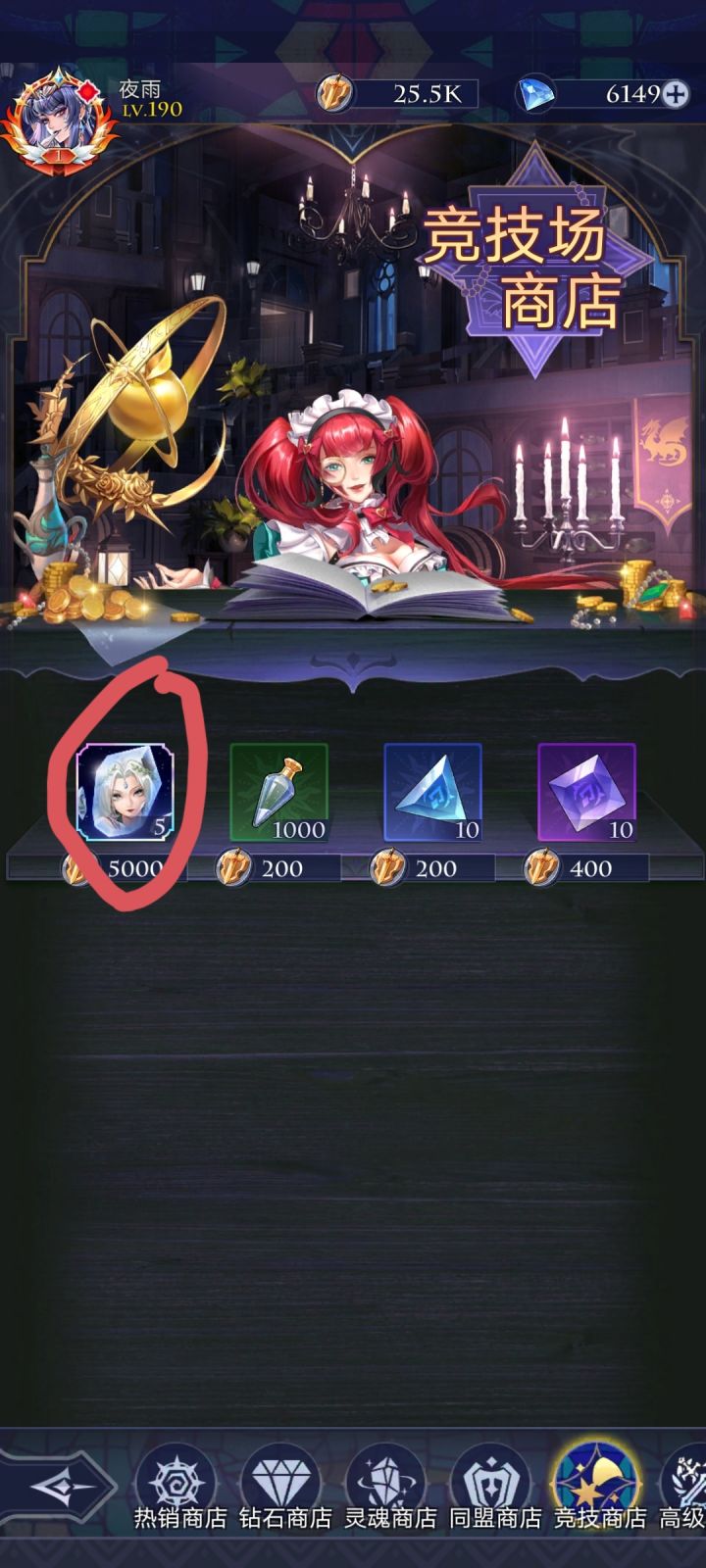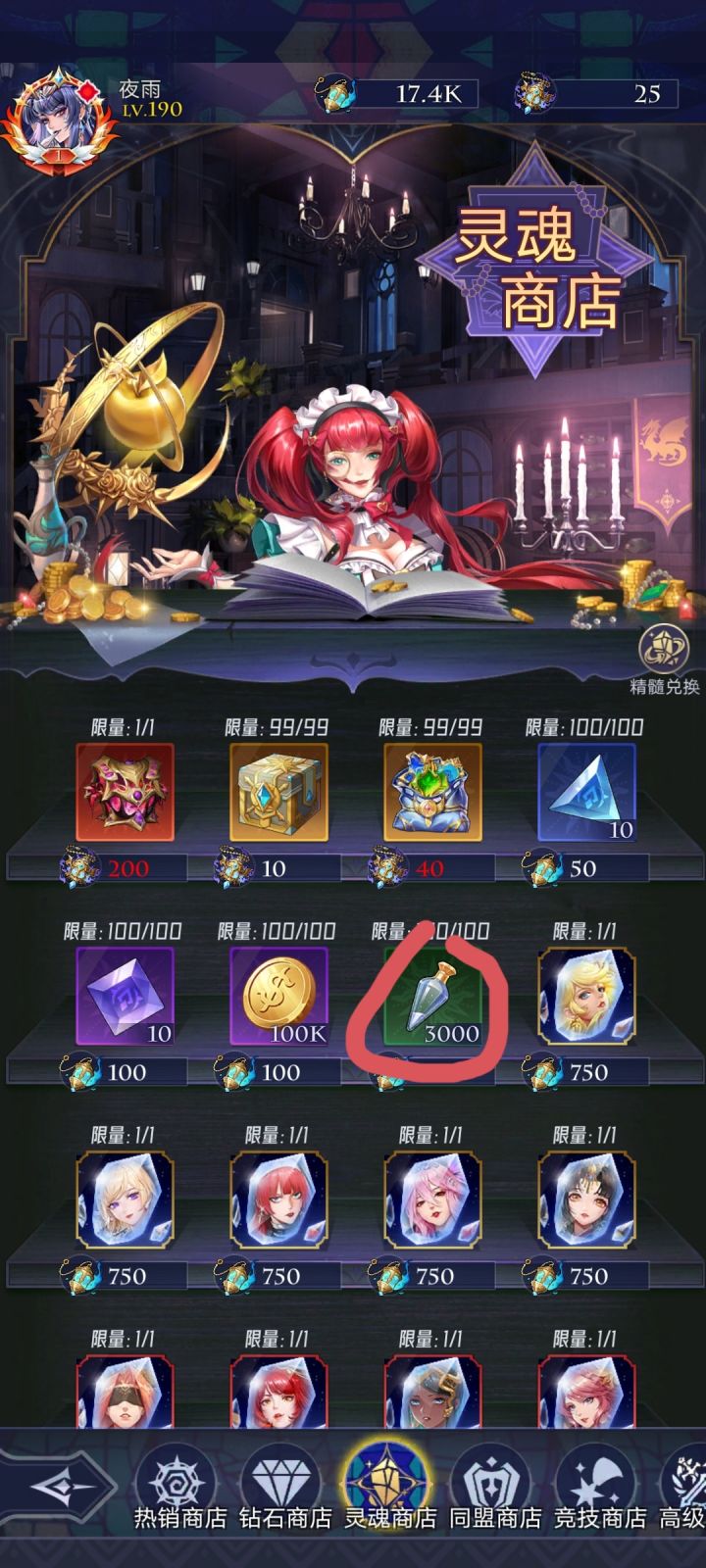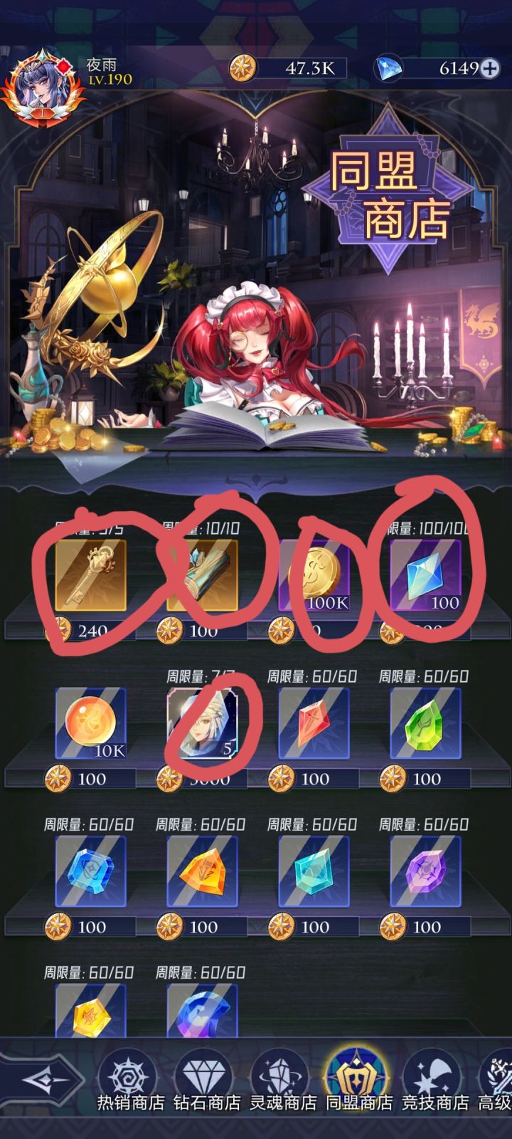 首先说明,本人先锋服老登,但还不是顶尖的那种,所以不要惊讶我的等级 热销商店 前七天因为有返利,钻石可买紫色召唤卷,龙血果实,御灵。金币可买的拉满,周限购拉满。推荐钻少的只刷新一次,钻石多的量力而行。 钻石商店无推荐,角色好感度上限时可买戒指。 灵魂商店无推荐,想买就买画圈的那个,另一个道具要ur满星之后再次获得才有,早着呢 同盟商店优