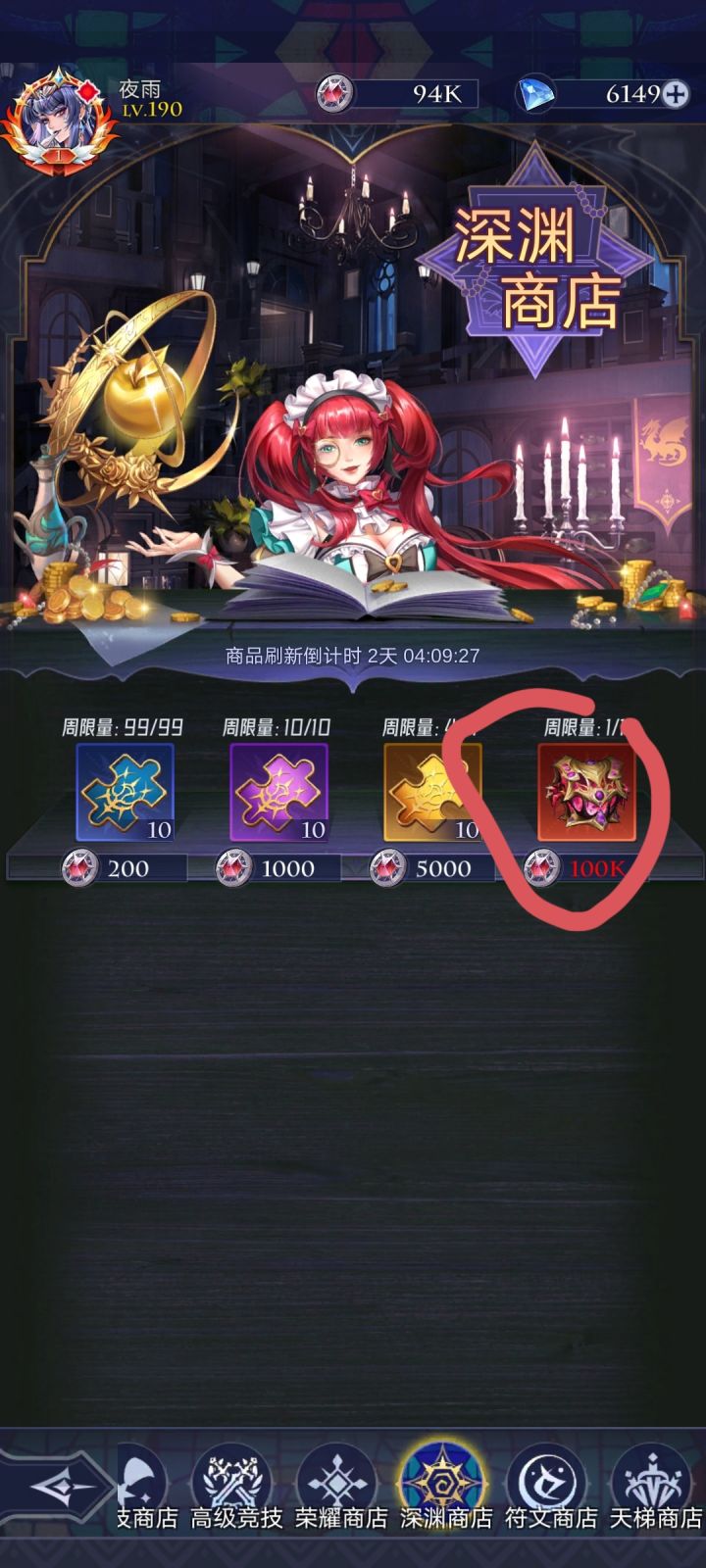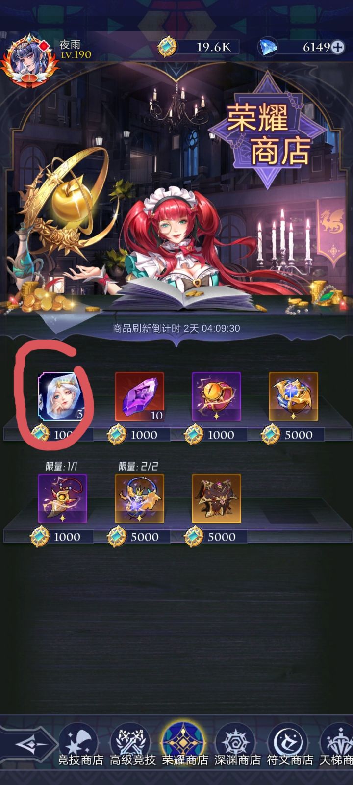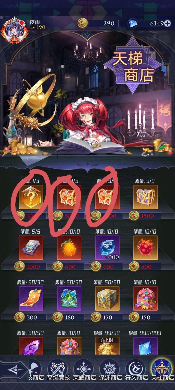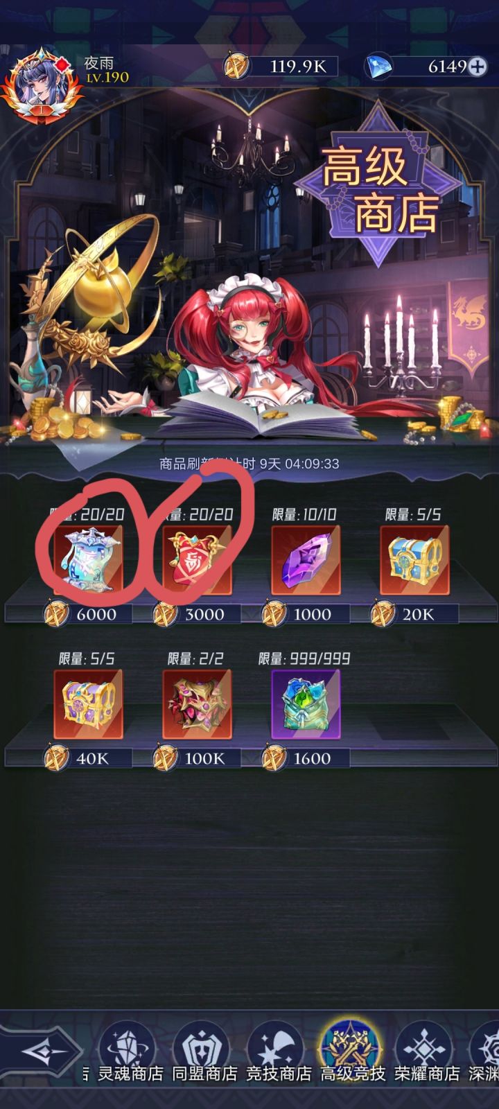 首先说明,本人先锋服老登,但还不是顶尖的那种,所以不要惊讶我的等级 热销商店 前七天因为有返利,钻石可买紫色召唤卷,龙血果实,御灵。金币可买的拉满,周限购拉满。推荐钻少的只刷新一次,钻石多的量力而行。 钻石商店无推荐,角色好感度上限时可买戒指。 灵魂商店无推荐,想买就买画圈的那个,另一个道具要ur满星之后再次获得才有,早着呢 同盟商店优