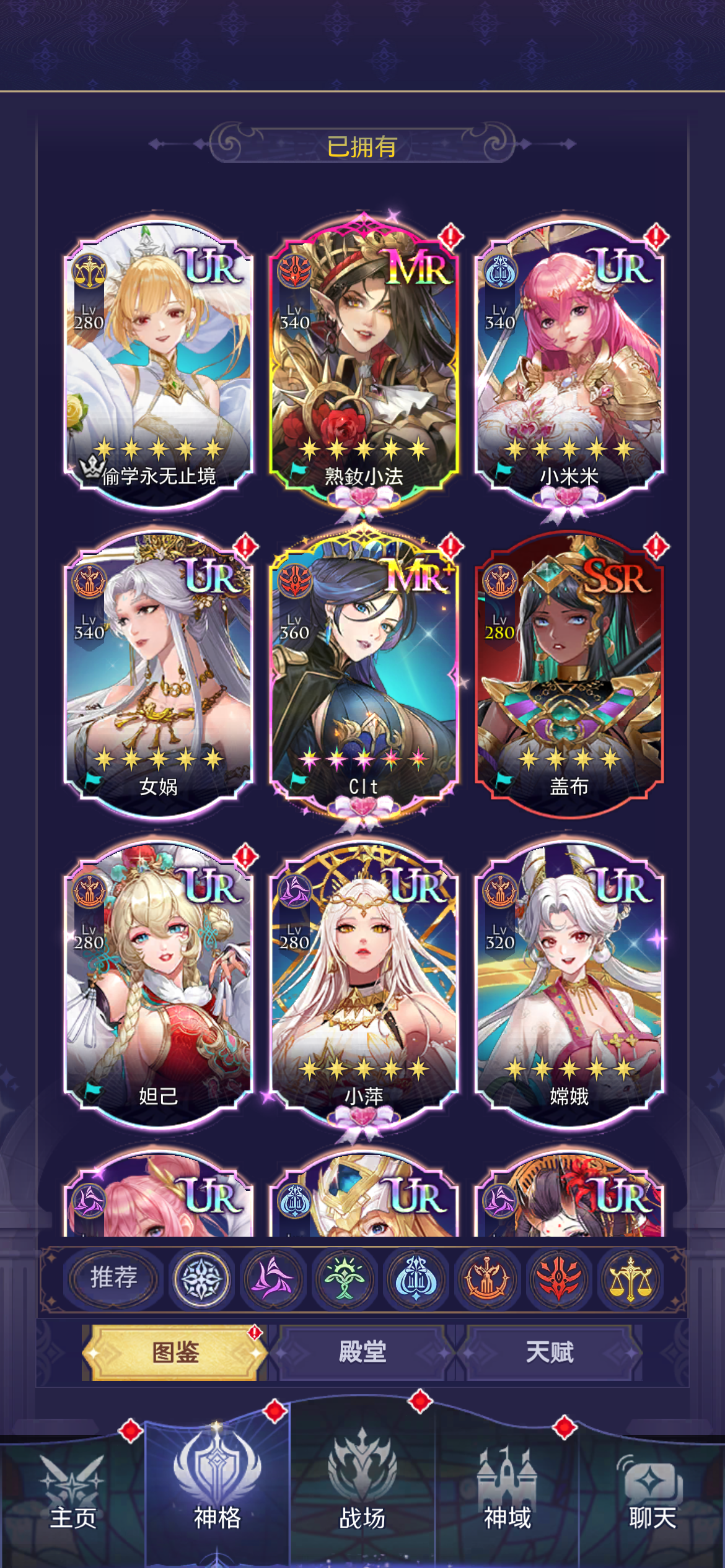不废话,直接主题,如果你不是重氪,那么你就需要一个开局号。首先赫拉,差点路西法,最次也要是个洛基,排名分先后。因切赫拉和路西法是唯二UR就是秩序/混乱的神格,也是最容易入手,白嫖就可以获得的强力女神!1.如何合理抽卡:这个游戏基本都是要保底才出UR极以上神格,所以如何分配抽卡就尤为重要了。这个游戏里有四种抽奖券,分别是上古召唤券,因为颜色是紫色,我简称他为紫票,可以抽随机抽各个阵营的女神,包括
