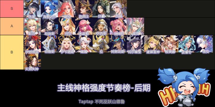 先叠甲,主观的,自主的,不全面的,仅供参考,如果有错,不要骂我,骂策划就行只包括能在上古召唤中抽到的角色,兑换角色不在排行榜中只按照UR技能效果进行排行首先,主线前期使用哈迪斯+妲己的组合,哈迪斯用dot快速压低血线,妲己补伤害后期可以更换为洛基主C(因为好看),搭配赫拉的攻击增幅和路西法的暴击增幅,伤害不俗(而且好看)海姆达尔,巨厚的盾和高额减伤,真的好用,帮我苟过了好几个BOSS