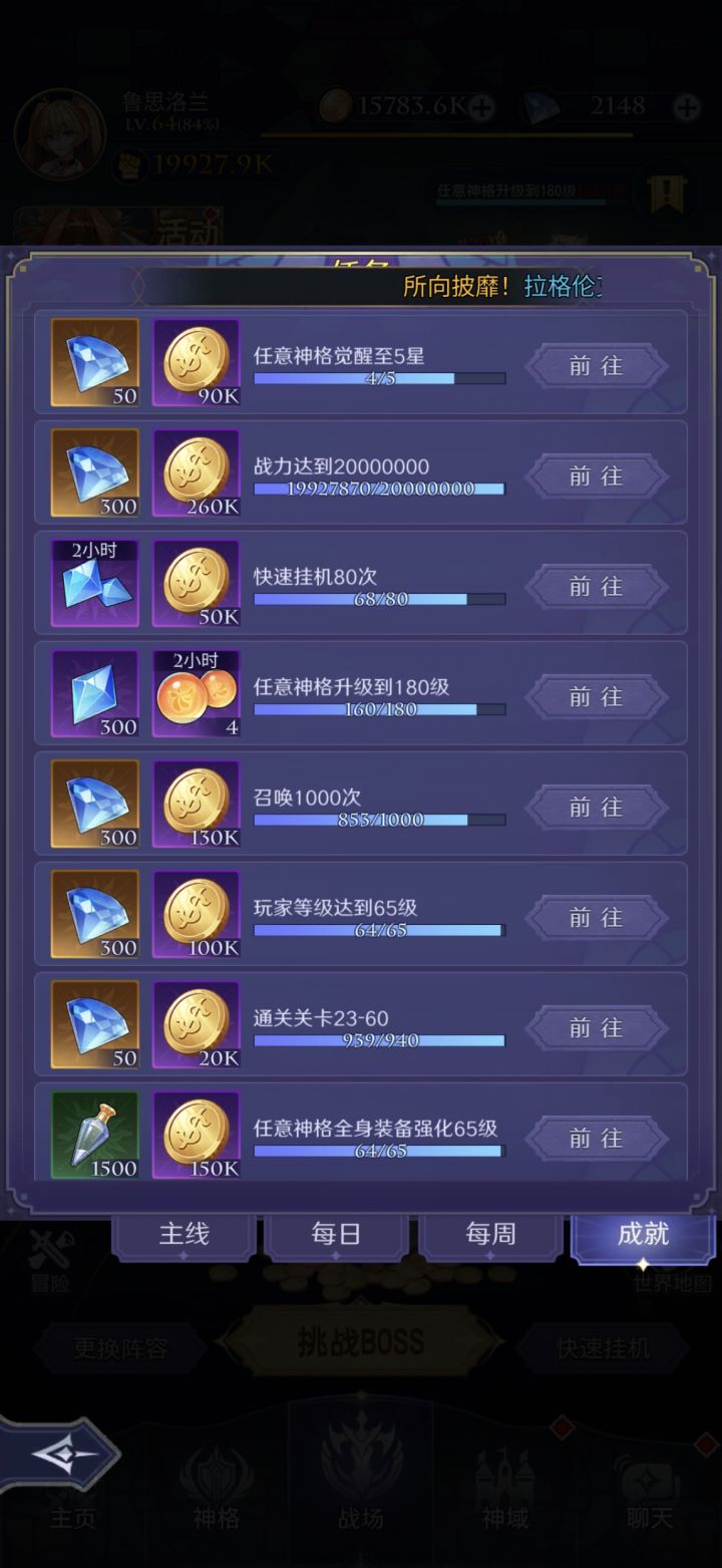 本人偷学永无止境 上届天梯全服第一曾把三个号分别在50天,40天,20天内通关普通主线 我的主线攻略包括角色,从神,神器,装备进阶,圣器,宝石,符文,御灵,星图,命星以及灵活占位,预计800M通关首先注明以下攻略是哈迪斯通关攻略,可能通关效率不及伊西斯但哈迪斯在其他的场景全能,适合绝大多数非重氪玩家角色:路西法(万金油辅助) 赫拉(需氪金获取 替代品:主角) 伏羲(增伤辅助) 女娲(U