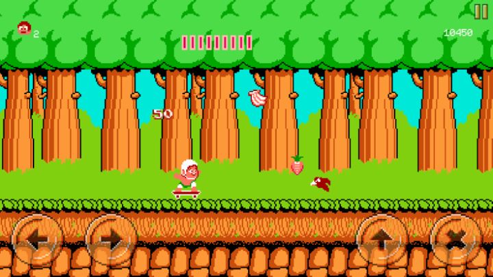 童年经典游戏,玩法简单,老少皆宜。 冒险者是一个穿着短袖的小胖子。 你需要控制住这个小胖子,通过不停地吃水果来补充能量。 途中,你会遇到各种危险的怪物、陷阱和机关。 虽然路上充满了危险,但路上也会出现各种不同效果的武器和滑板, 你可以捡起它们让你变得更强,有时你还可以遇到精灵来保护你,让你所向无敌, 没有怪物可以阻挡你的道路。