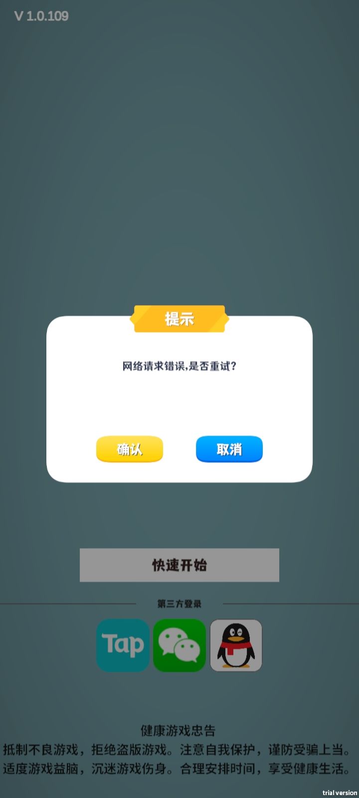 进去之后先登录:Tap微信QQ登录都登不上去,说网络请求错误,点确认重试或切换网络(数据/WiFi)也没用取消都无法登录进游戏;点快速开始以后直接黑屏闪退;再或者是直接卡死,什么都点不了。切换网络(数据/WiFi)也没用。