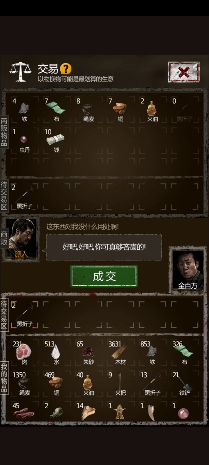 众所周知铁铲和黑折子在古董商和旅人买卖有差价,所以11个黑折子可以搬空古董商和旅人,但是前期资源比较少,每次搬空商人消耗11个黑折子还是补给不上,为此给各位肝帝奸商们提供一个消耗更少资源的方法 先上成果 首先通过黑折子把商人搬空,然后利用差价把商人的黑折子搬到只剩11个 让后用古币或者钱购回黑折子 再通过黑折子的差价购回古币或者钱 以此类推 和旅人交易用钱和古币交易比例相同 和古董商用钱交易同旅人
