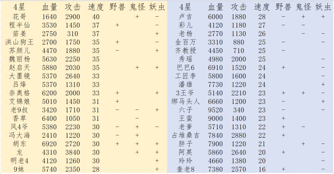 声明:每个人游戏理解不同,排名仅供参考,技能和被动技能评分很难定义,所以未考虑在内,用了点黑科技,不喜勿喷。 定义: 1.血量比=人物血量/吕峰血量 2.力速积比=(人物力量*速度)/(吕峰力量*速度) 用来衡量人物秒伤 3.速度比=人物速度/吕峰速度 用来衡量人物产豆 4.总评分=血量比+力速积比+速度比 天赋定义: 备注:因为游戏内鬼怪占大多数,所以我加大了鬼怪加成和减益,野兽+25%,鬼怪+