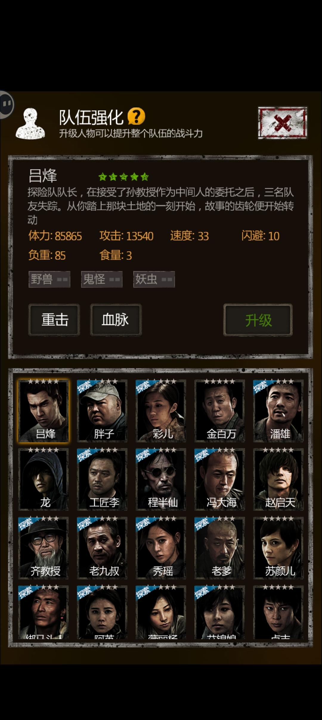 推荐人物:吕峰(主角不用说,能带镜子,想卡bug换下的当我没说。缺点就是六边形废物,啥都不差,但啥都不强。配合胖子关键时刻能充当辅助坦克,比如打鬼王的时候,可以舍弃来攒豆子);胖子(魔窟25到30层感觉特别好用,很多怪能用嘲讽抗伤害,配合薇丽杨能持续满状态避免意外,配合九妹能烧死绝大多数boss,包括鬼王。缺点是攻速慢,怕遇到群伤怪,这时嘲讽就别先放了,留着豆子用薇丽杨先回血);桑吉(个人感觉特别