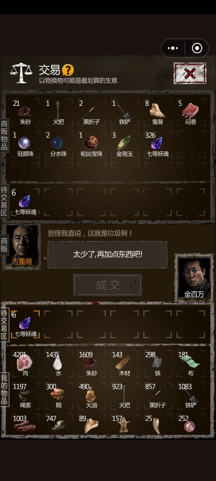 话说我也是个老菜鸟了,以前玩到魔窟10多层,老费时间了,后来游戏登录不了就不玩了,现在免费了,话说你们怎么搞材料的?商人左右倒卖?看图难道我的商人要聪明一些?