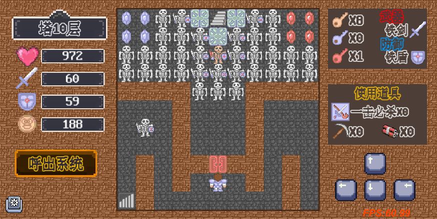 开局路线:1楼直接杀到3楼,到系统商店购买4金币的一击必杀道具,直接斩杀大蝙蝠。 一直杀上5楼,拾取铁剑。 回到4层把左下屋子的钥匙拿了,回到六楼开所有的黄色门,避开高伤怪物,同时优先去清理带有宝石的屋子里怪物。 七层系统商店购买一击必杀,直接杀掉巫师, 直接达到9楼,系统商店购买稿子,破墙拾取铁盾。 从这开始清前10层的怪物(建议如果金币达到88金币 建议优先解锁怪物图鉴),如果遇到伤害高的怪物