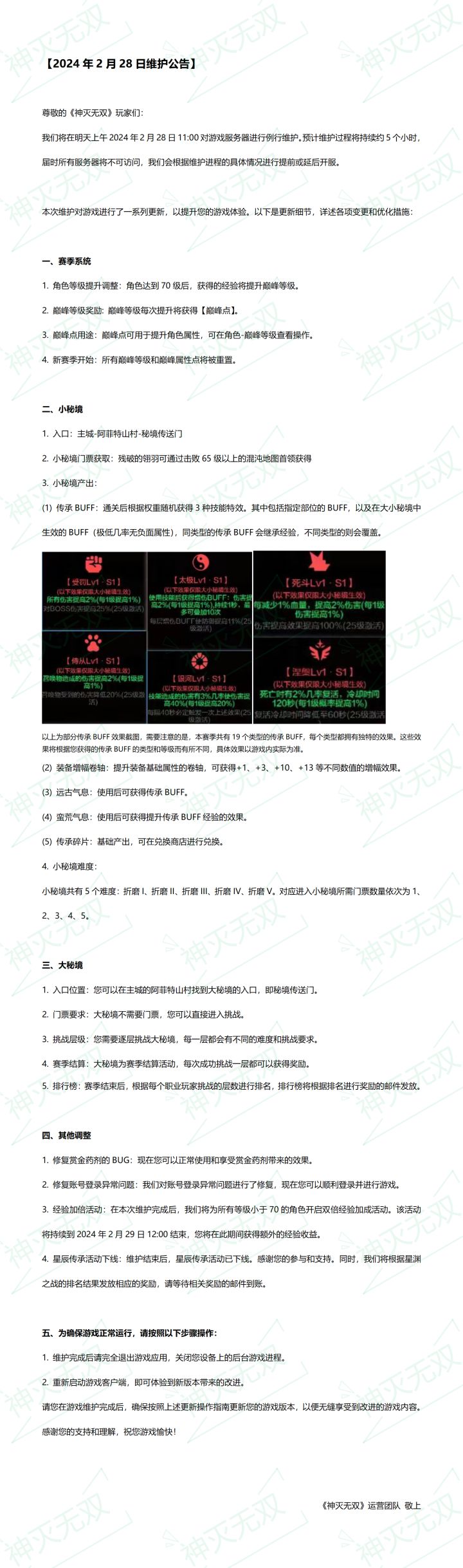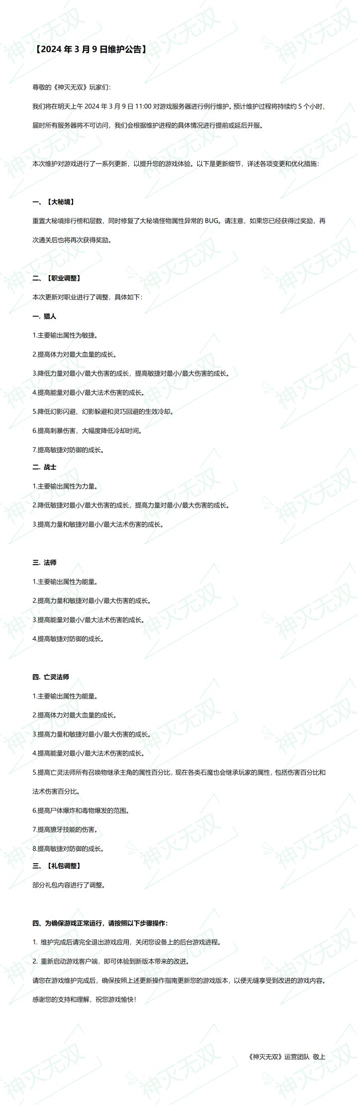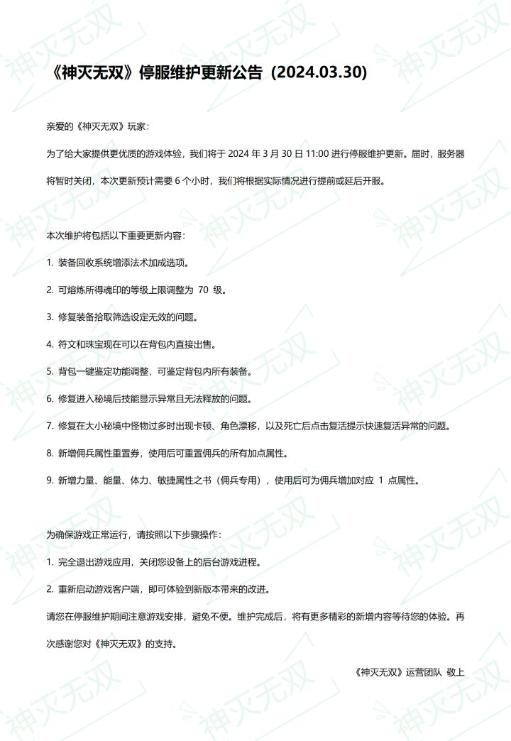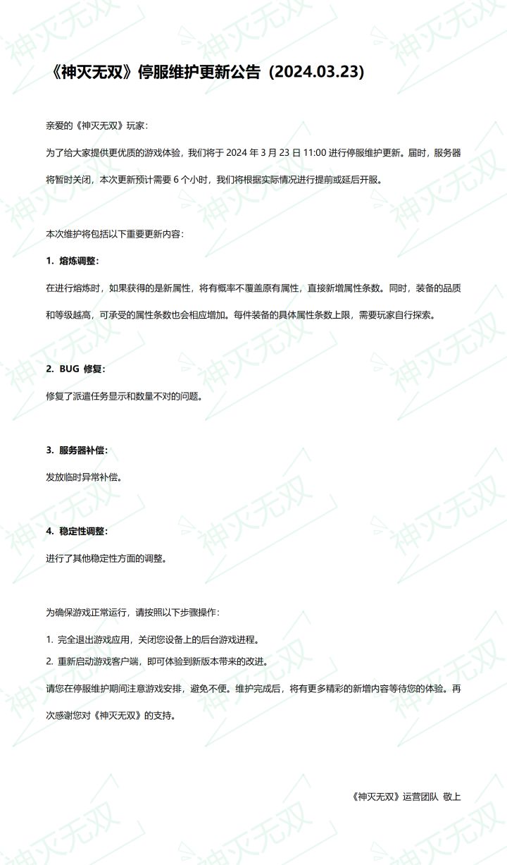《神灭无双》停服维护更新公告
