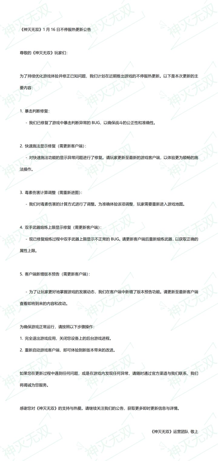 《神灭无双》1月16日不停服热更新公告