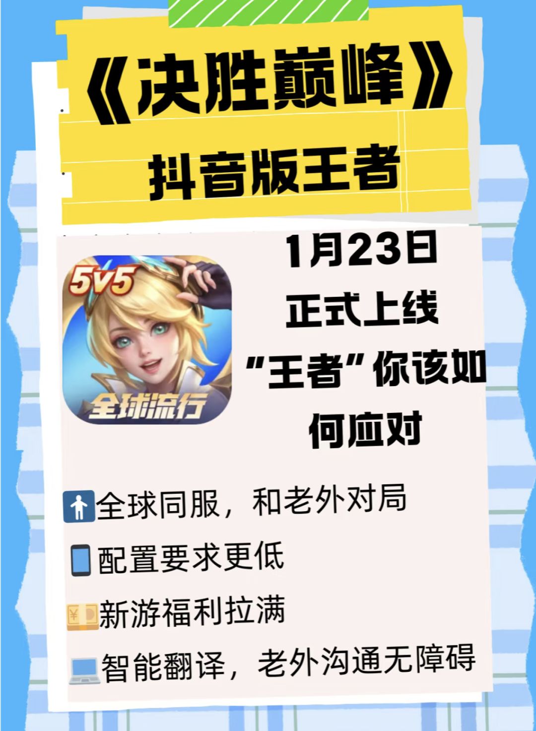 抖音旗下的全球moba手游决胜巅峰宣布在1月23日上线! 面对这个近期来势汹汹的挑战者,王者荣耀该如何应对呢? 决胜巅峰目前优势/特色 ⭐全球同服,可以打老外,还有智能翻译,沟通无障碍 ⭐海外用户量庞大,累计突破15亿老外。 ⭐可以给王者,lolm一定危机。 ⭐配置要求更低,对局时间更短。 大家觉得决胜巅峰会到达什么样的高度呢? #决胜巅峰 #决胜巅峰国服 #决胜巅峰公测 #游戏种草计划 #游戏推