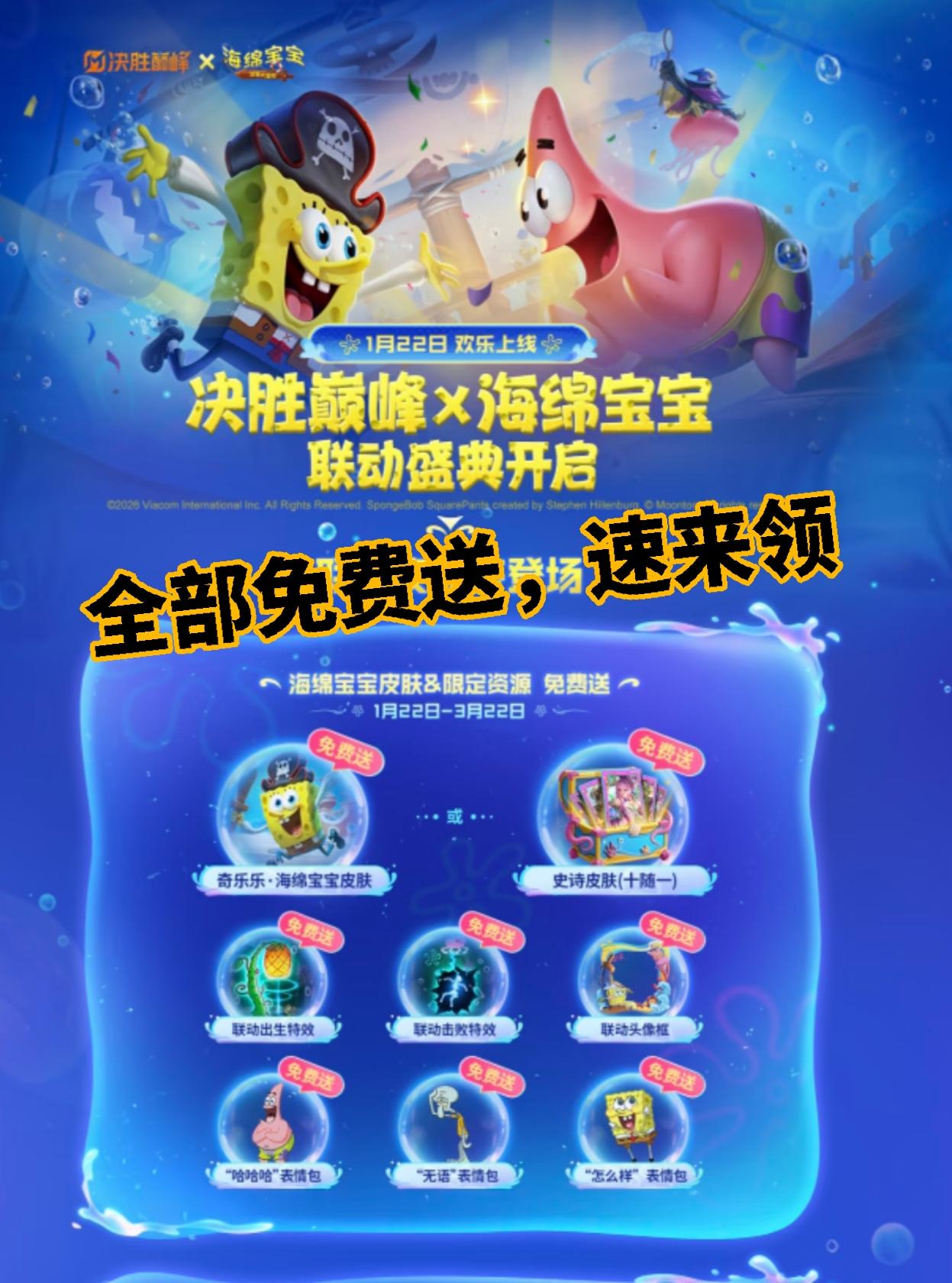 《决胜巅峰》x《海绵宝宝》联动1月22日即将上线!海绵宝宝与派大星即将来到黎明大陆与大家一同展开新的冒险! —— 欢迎来到黎明大陆!—— ▼《决胜巅峰:乘云直上》S5新赛季现已开启! 1周年超级福利《决胜巅峰》x《海绵宝宝》联动1月22日即将上线! 海绵宝宝与派大星的联动皮肤、比奇堡联动特别玩法,这次由你来成为比奇堡餐厅主理人。 特别提醒:《决胜巅峰》1周年专属福利,海绵宝宝皮肤免费送!