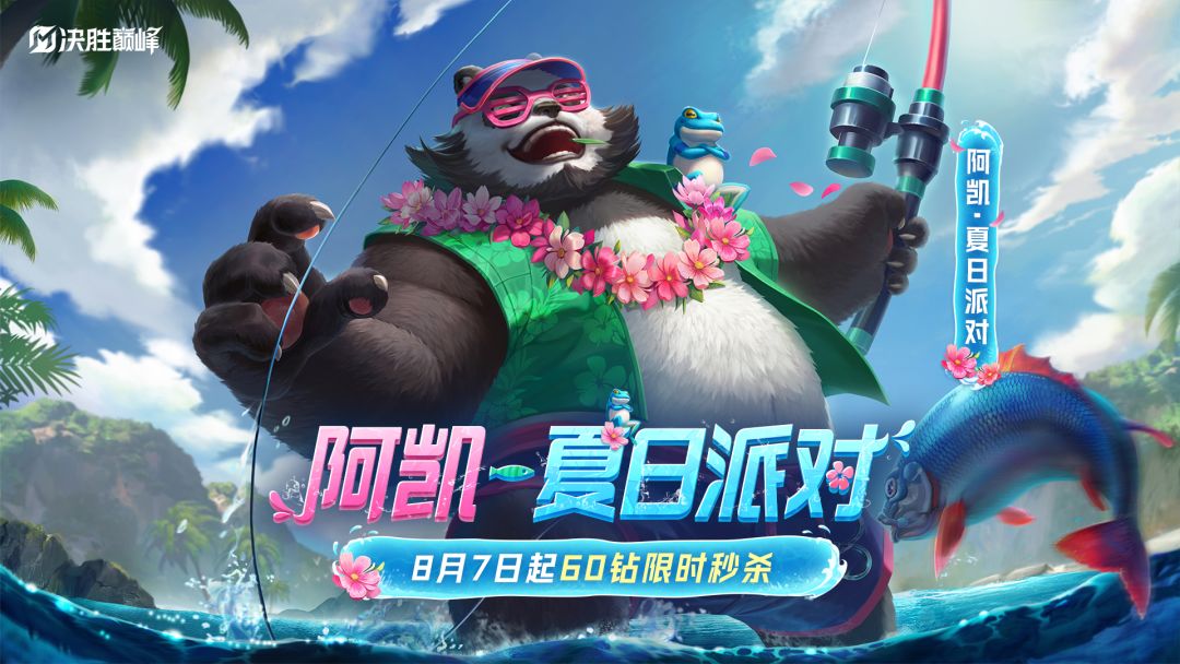 请选择你的派对方式: 日光浴、堆沙雕、赶海、嬉水…… 以上都太乏味?不如—— 和阿凯一起来一场惬意的海钓吧! 8月7日,阿凯全新皮肤「夏日派对」将正式上架商城!8月7日-8月13日期间,享60钻石限时秒杀特惠福利,活动结束后将恢复原价,售价480钻石。 《决胜巅峰:荣耀亚洲》8月全新版本「巅峰竞技场」开启!戳下方立即下载,巅峰英雄、巅峰联动、巅峰皮肤、巅峰对决乐趣无穷。臻品皮肤周周送,惊喜福利情报