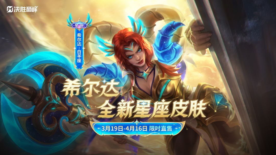 3月19日-4月16日,希尔达史诗皮肤「白羊座」将加入商城,前往【商城】即可兑换,售价880钻石。首周可享七折兑换优惠。 *展示视频为测试版本,以实际上线效果为准 —— 欢迎来到黎明大陆!—— ▼《决胜巅峰:此刻共振》S6新赛季现已开启! 新英雄「薯片」现已登场,131位英雄全部上线,变形金刚联动3月19日限时返场!「穹极诗章」系列皮肤4月2日上线!更多赛季内容及福利爆料敬请期待!关注小决,切勿错