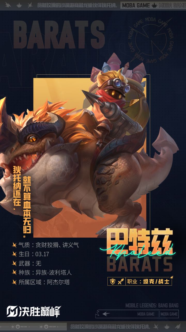 生为波利塔人,巴特兹从小就被教导要爱财,也要取之有道。不过贪财归贪财,可不能什么都吃啊!!快让狄托纳把娜娜吐出来!戳视频,让娜娜带你认识一下这位游走于沙漠中的黑市商人吧~5月15日,全新战士英雄「巴特兹」将正式登场!前往【商城】即可兑换,售价12999战场点或480限时钻石,首周享战场点7折优惠。5月15日-5月21日期间,参与活动还可免费获取新英雄「巴特兹」~*展示视频为测试版本,以实际
