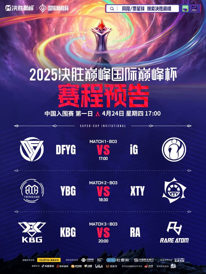17:00 @DFYG决胜巅峰俱乐部 vs @iG电子竞技俱乐部18:30 @YBG决胜巅峰分部 vs XTY20:00 @KBG决胜巅峰分部 vs @RA决胜巅峰分部中国入围赛首日大战一触即发!揭幕战中,补强后的DFYG与iG强势对决,谁能先下一城?第二场,大换血的YBG迎战海选黑马XTY,是老牌调整见效,还是黑马续写传奇?压轴战,老牌魔王KBG对