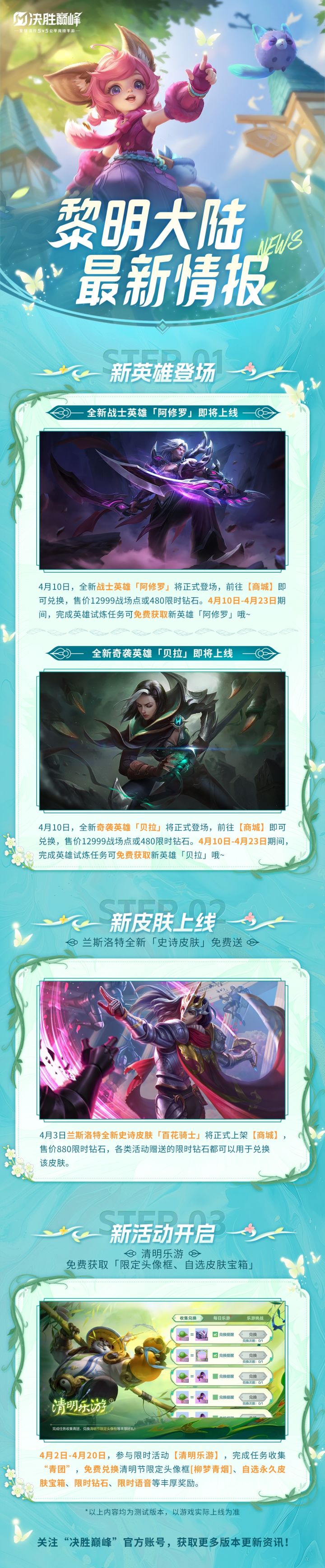 ✧(≧ꈊ≦∗)✧趁着春日明媚的阳光,娜娜准备再次踏上巡游黎明大陆的旅程~看!娜娜打听到了什么——新英雄、新皮肤、新活动即将到来!这些惊喜可不要错过啦~◆新英雄登场-全新战士英雄「阿修罗」即将上线-全新奇袭英雄「贝拉」即将上线◆新皮肤上线-兰斯洛特全新史诗皮肤免费送◆新活动开启-参与「清明乐游」活动免费获取限定头像框、自选皮肤宝箱更多详情请戳图查看↓↓↓