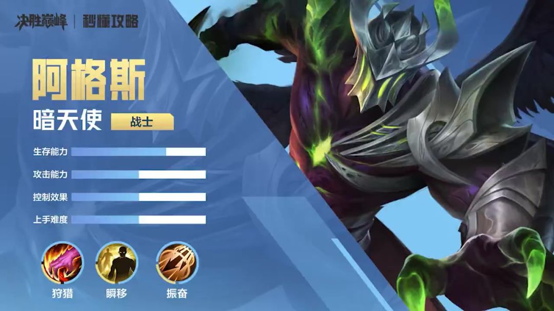 1分钟上手阿格斯!【技能介绍】1技能:向前方伸出魔能之手,命中敌人后造成眩晕并将其和自身向中间拉拢,再次使用向指定方向位移2技能:向前刺出魔剑,对敌人造成伤害并减速,同时附加4秒魔法效果,在此期间敌人移动就会受到持续伤害并留下路径,阿格斯在路径内移速增加大招:开启大招后,立即清除自身异常状态并回满能量,4秒内不被击败,大招期间的伤害转化为大招结束后的生命值【加点顺序】主1副2 有大点大