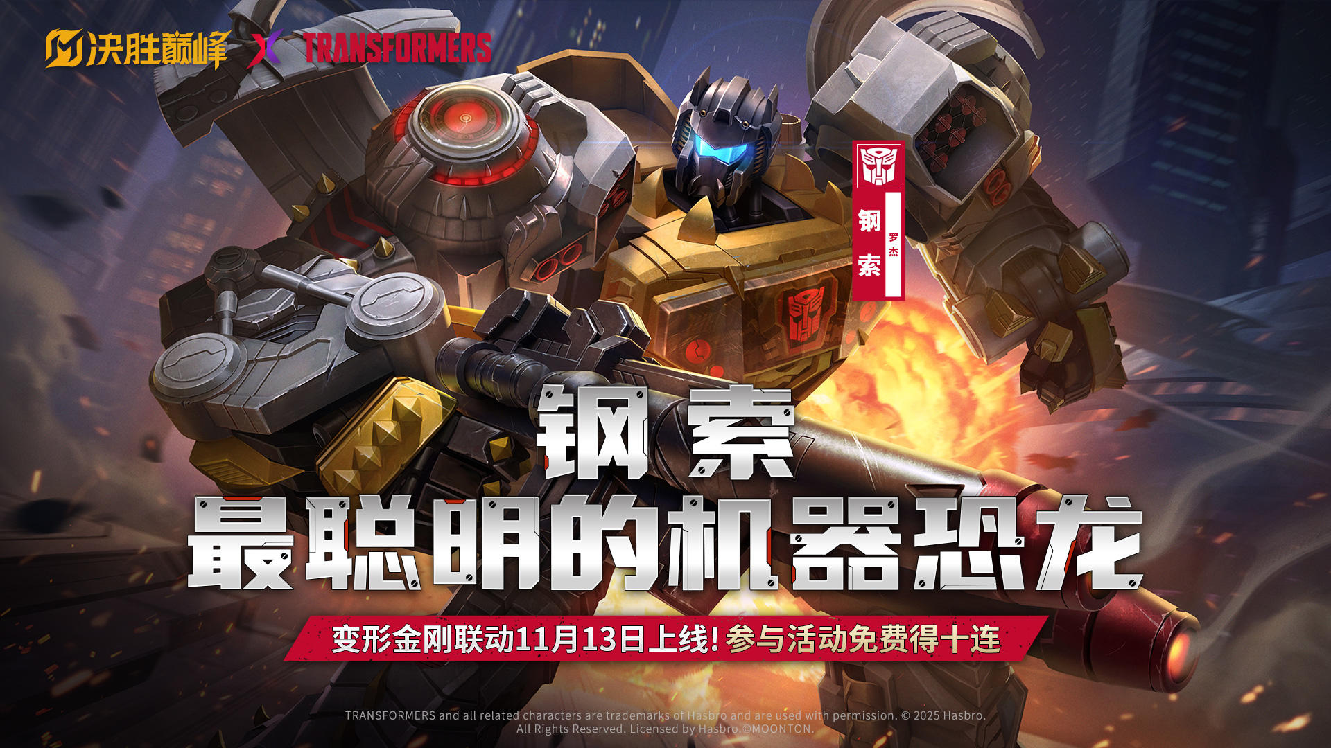 “钢索,最聪明的机器恐龙” 首次十连必得钢索!11月13日,变形金刚联动限时活动重磅来袭! 擎天柱、威震天、大黄蜂、红蜘蛛、钢索、声波与机器狗,人气角色全员召集!快来Pick你的变形金刚。 *展示视频为测试版本,以实际上线效果为准 —— 欢迎来到黎明大陆!—— ▼《决胜巅峰:深渊之主》S4新赛季现已开启! 11月13日变形金刚联动限时来袭,首次十连必得钢索。更多赛季内容及福利爆料敬请期待!关注娜娜