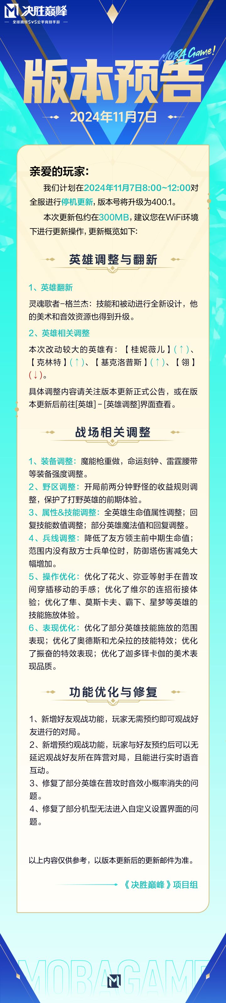 亲爱的玩家:大家好!《决胜巅峰》11月7日停机版本更新已完成,公告奉上!戳图查看详情↓↓◇◆娜娜小贴士◆◇-英雄调整与翻新1.英雄翻新:灵魂歌者-格兰杰2.英雄调整:桂妮薇儿、克林特、基克洛普斯、翎-战场相关调整1.装备调整2.野区调整3.属性&技能调整4.兵线调整5.操作优化6.表现优化-功能优化与修复1.新增好友观战功能2.新增预约观战功能3.修复了部分英雄在普