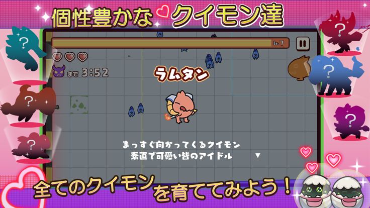 敵の猛攻を避けながら、クイモンに敵を食べさせて自身とクイモンが成長する!