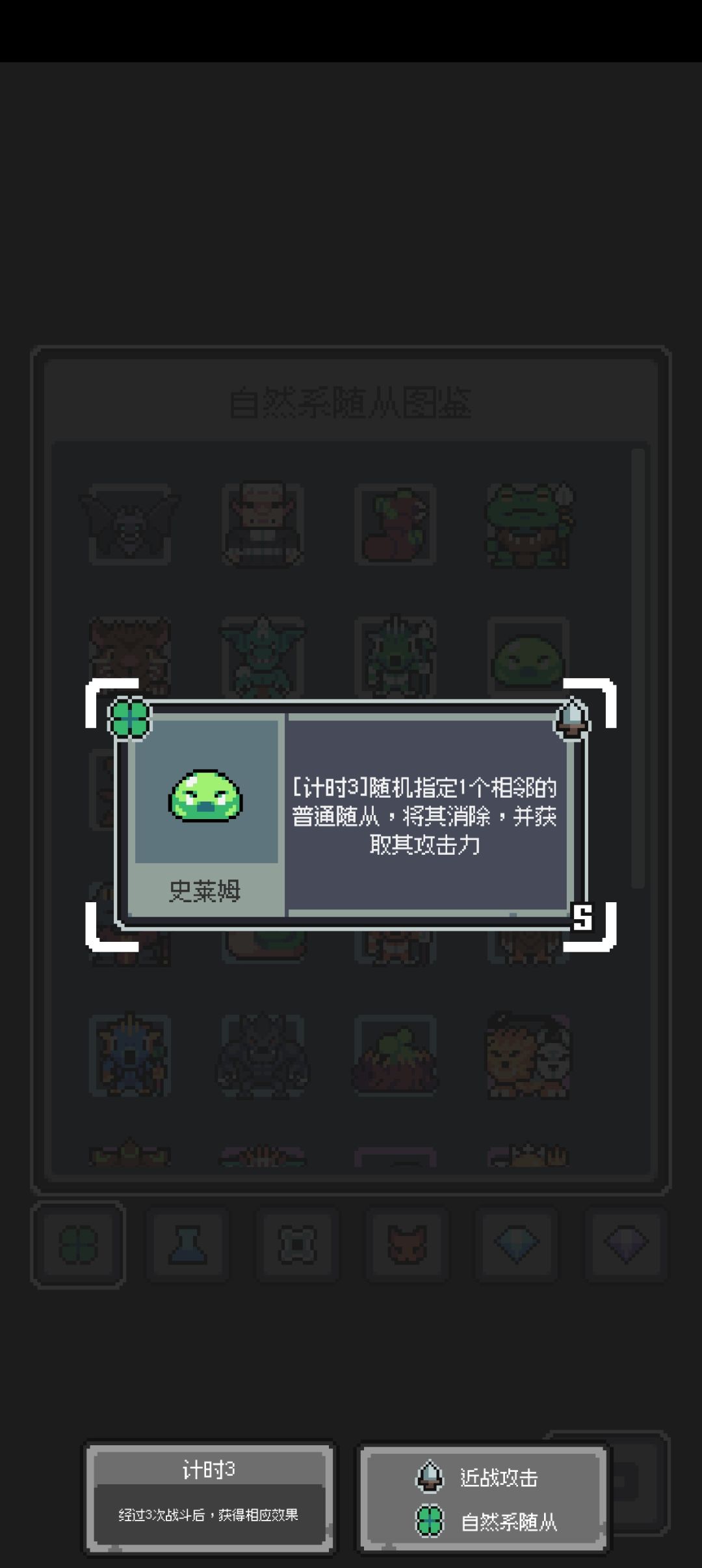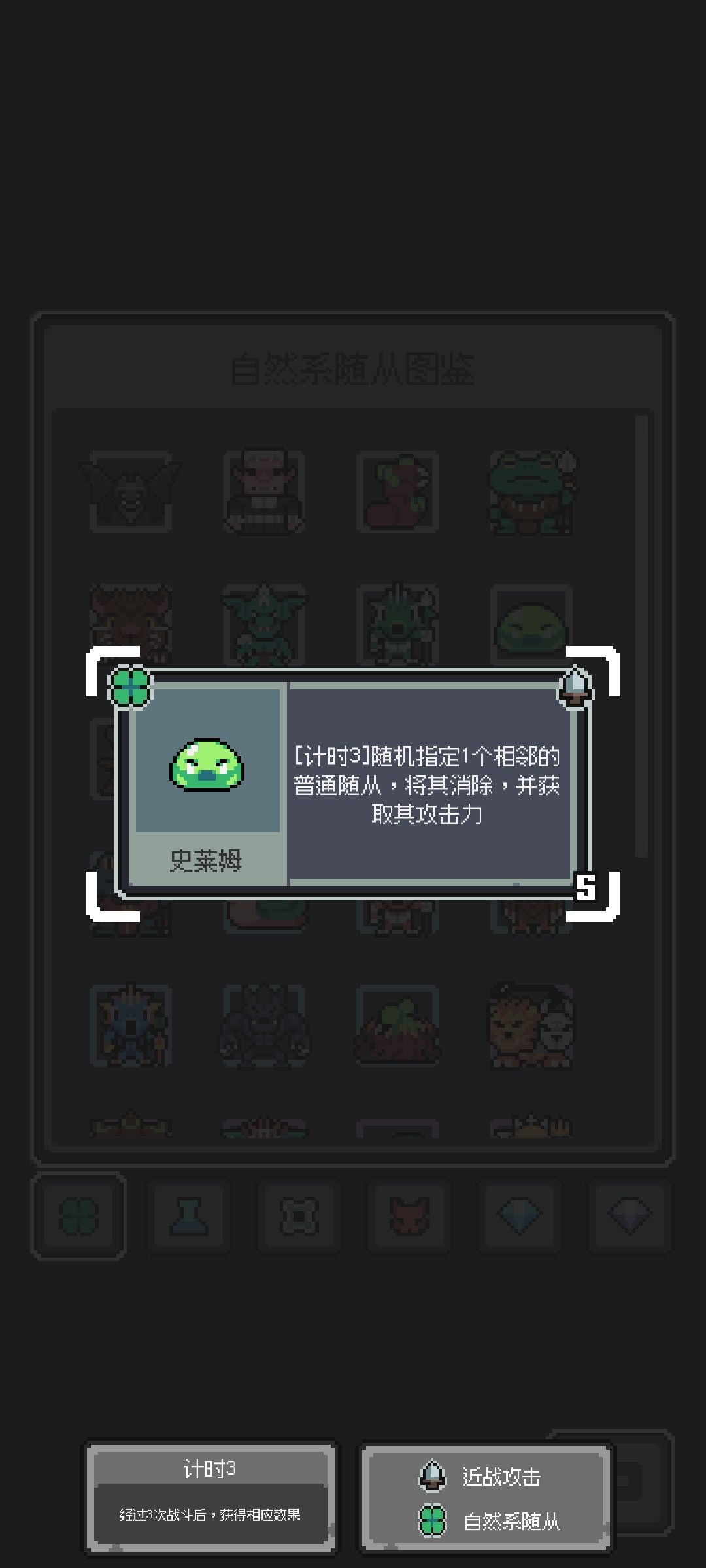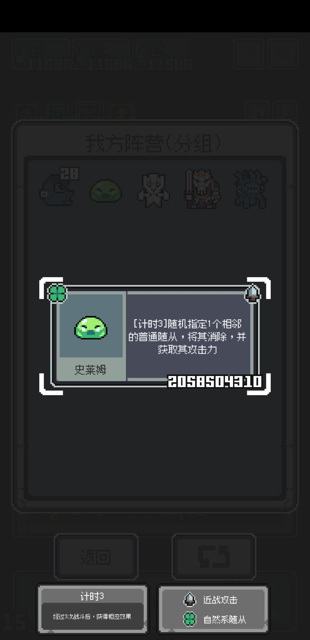 核心用偶数宝藏的戒指,找核心宝藏 计数3自然随从攻击力,自然转换虚无,普通随从消除给普通攻击力,史莱姆冲击,冲击伤害增加,必定冲击。其他的就拿一些给刷新术的就行 运营思路 除了自然传说随从,和龙系列,虚无传说大王和稀有弓箭手(被消除随从就加攻击力),给自然随从加攻击力的组构体传说,其他都不要,其他只拿普通随从。 第一波随便拿 平时不搜等偶数波找宝藏 三波后可以稍微搜一下史莱姆 凑够6个史莱姆就可以