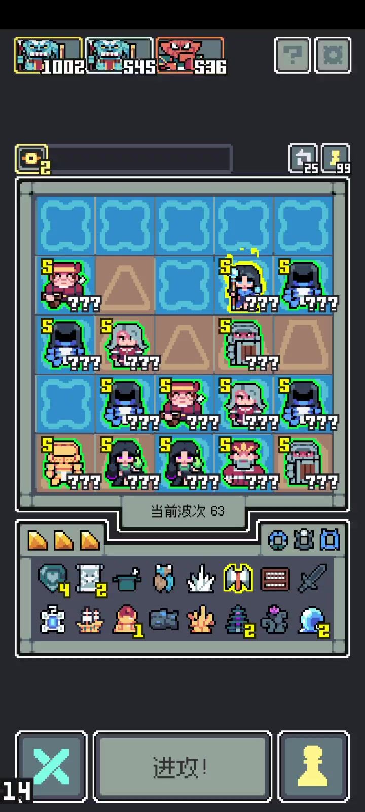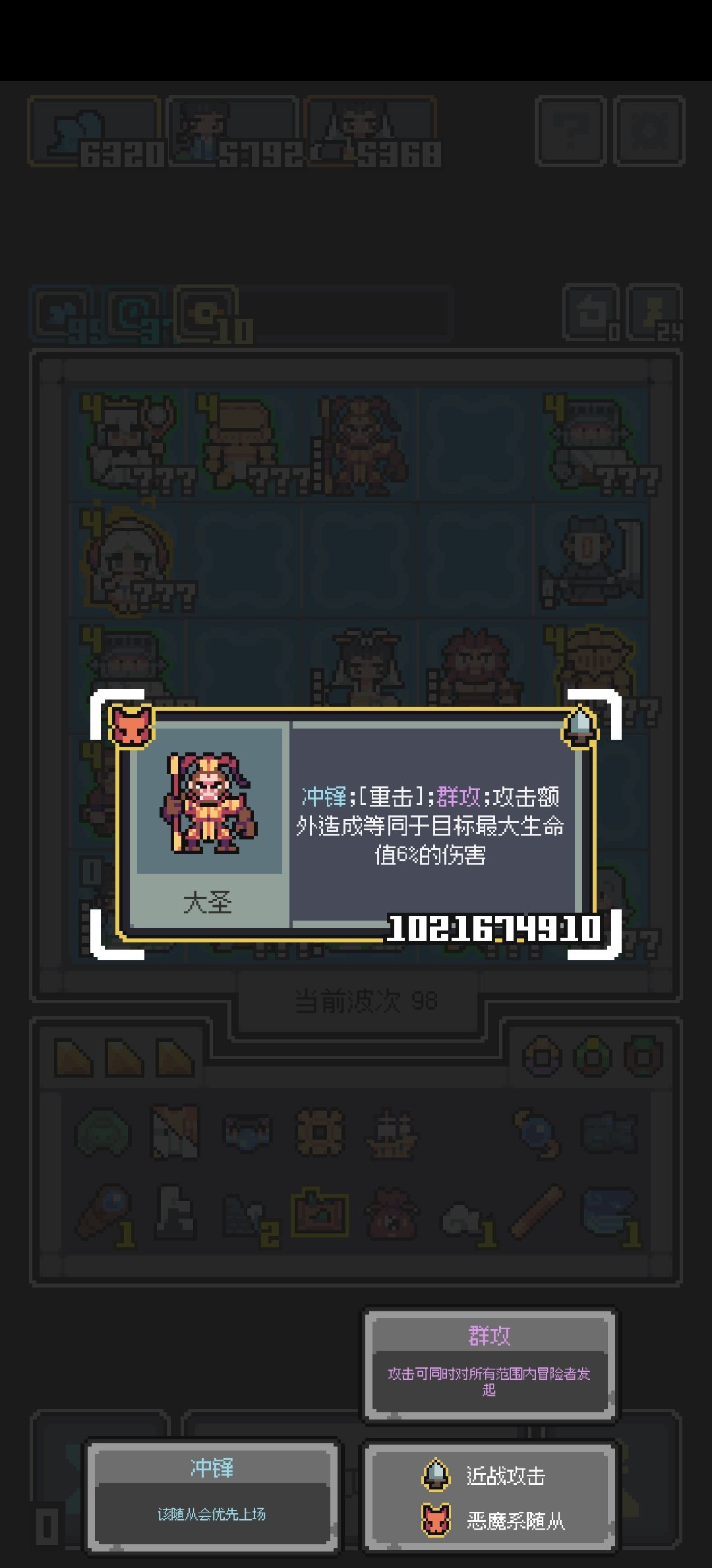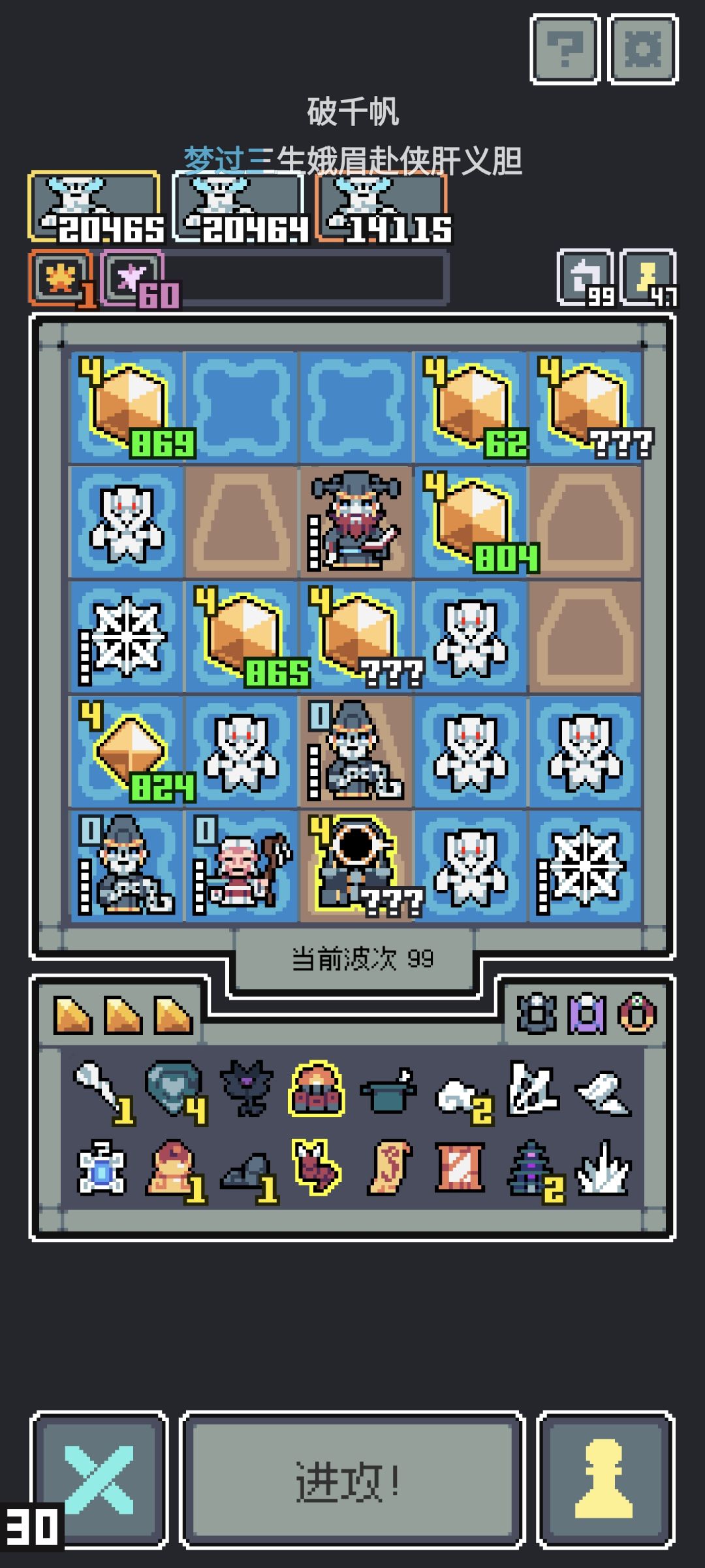 差不多40的时候就14只猴哥,我还想上去给他刷攻击已经刷不了了,开局就秒杀所有敌人,直接开始下一轮,完全无法对后面增加的13只猴弟进行进化,上场就是13-14只猴哥和敌人,没有一点空位,然后清场,后面13只猴弟还有一堆别的东西在仓库坐牢。 说下玩法,开局随便弄点啥,种多两个消除花,后续清场用的,早点把地图海铺起来,14轮前把宝船弄到手就行,然后开始养史诗,记得千万别选到传奇(传奇除了猴弟都别选),