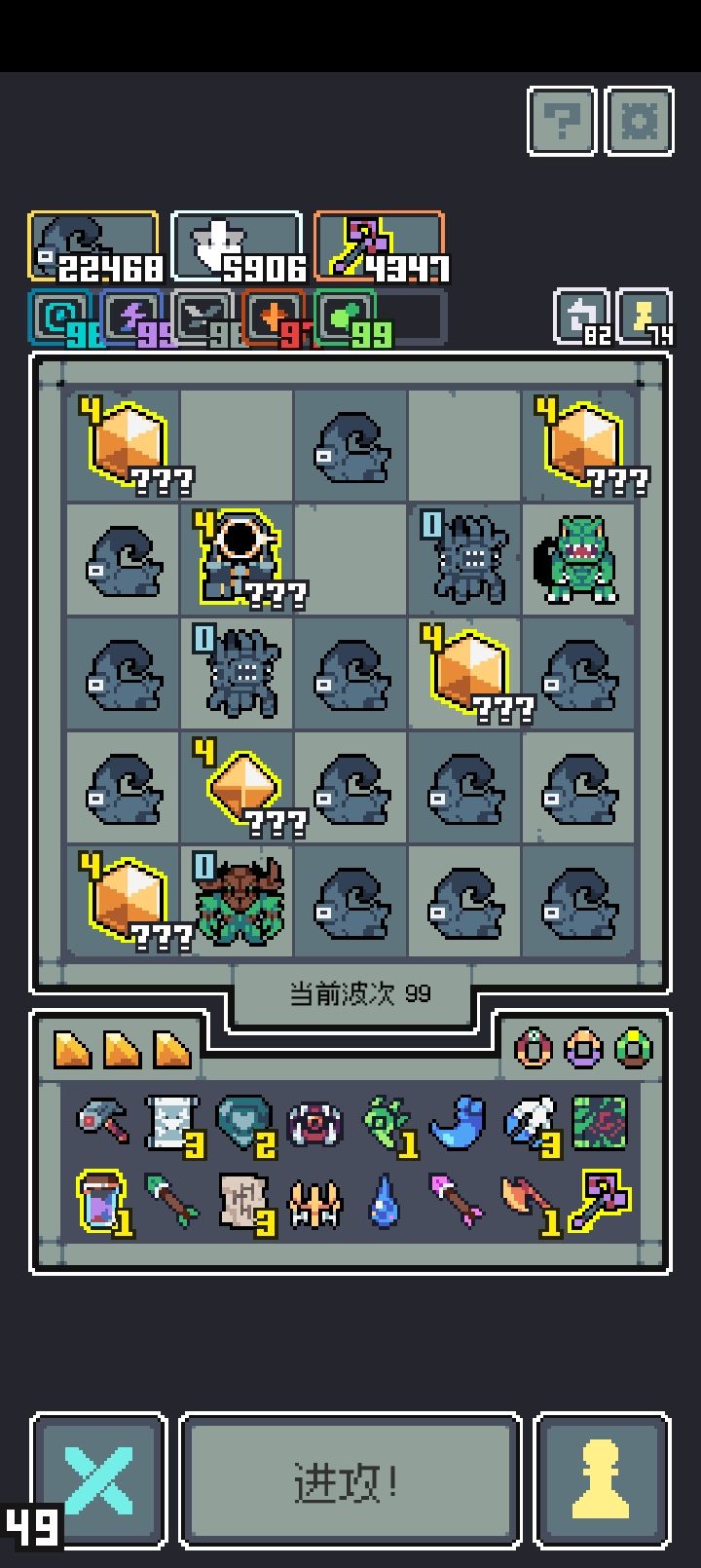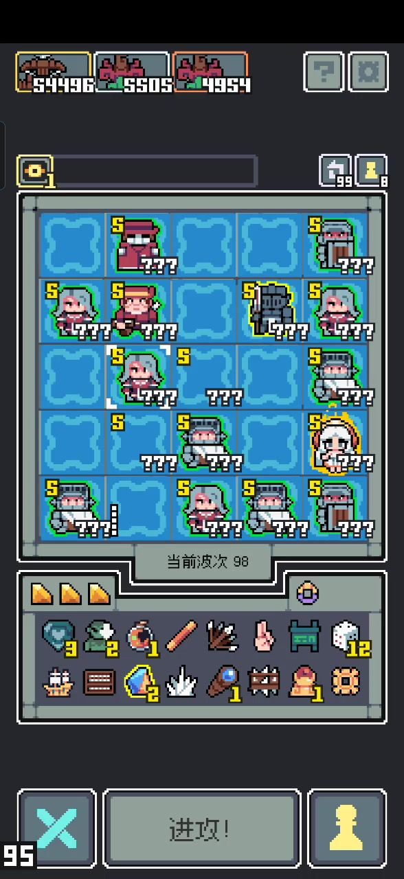 成型后一直跳过就行了,核心是 神秘羊皮纸 牺牲触手给其他触手攻击,和 不灭王冠 普通随从被消除随机给另一个普通随便攻击力。 左脚踩右脚,一会儿就全员9999了。 打100层的boss还需要个 太阳能战斧 牺牲最高攻击的普通怪,全屏打4倍攻击的伤害。