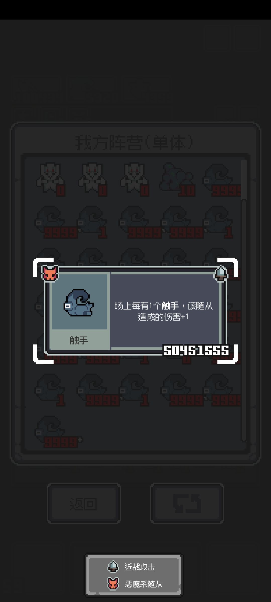如图, 普通随从被消除后有一个普通随从获得其攻击力 每两回合消除攻击力最高的普通随从,对所有人造成四倍伤害 每四回合随机消除一个触手,始所有触手获得其攻击力 理论上攻击力可以无限叠加