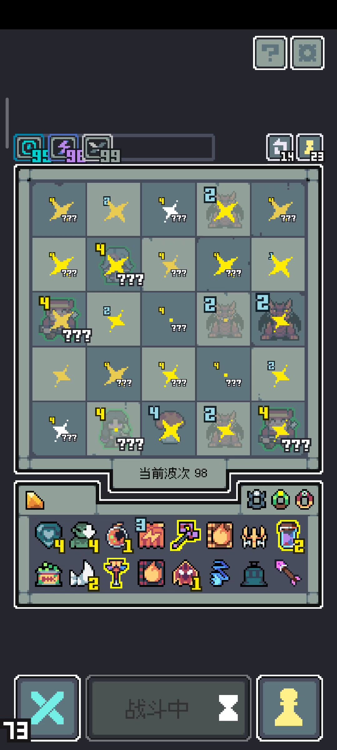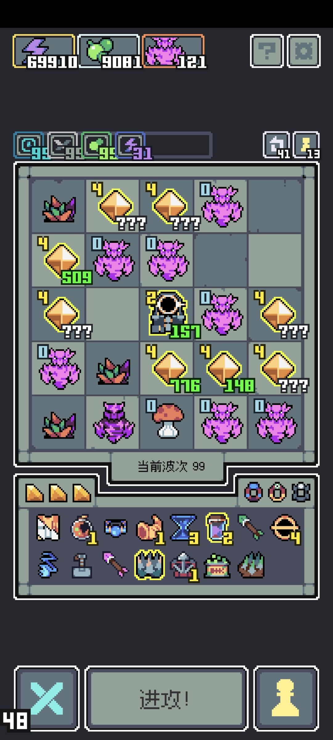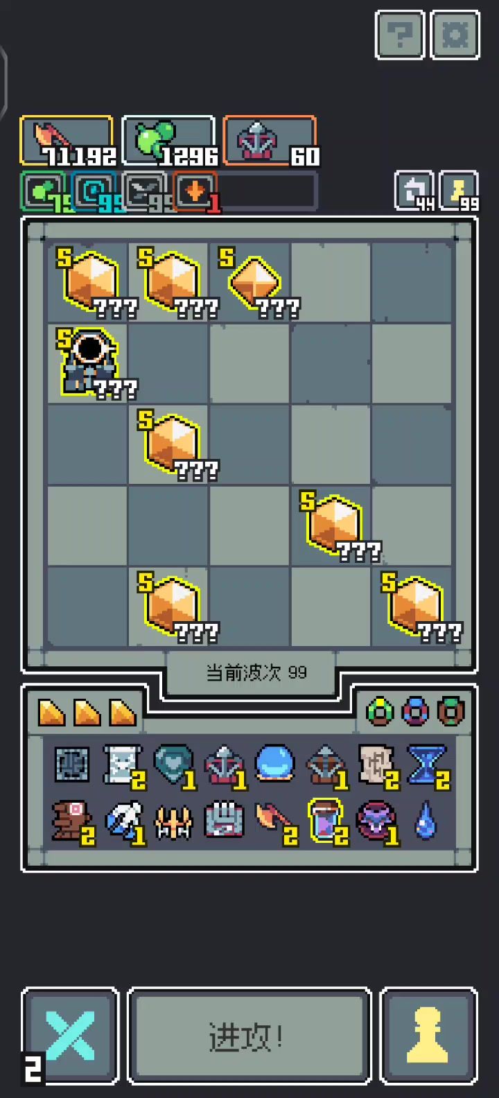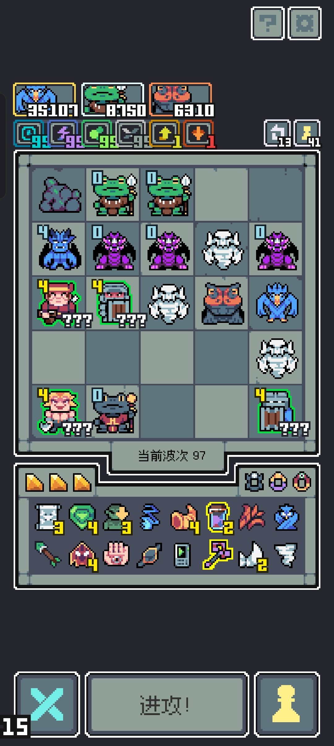 无尽99层波刃输出流: 宝物核心选择黑暗合剂把脆弱叠99层以提升基础伤害,之后利用复读机伤害翻倍的特性对盗宝团造成高额伤害。(伤害补充财宝选择大鸟造成三次伤害那个以及毒箭确保毒层数在99)另外为保持高效输出可以把加速也叠上去好确保大鸟以及青蛙的波刃在每回合造成伤害。(这里建议用龙蛋幼龙的加速财宝,前期刷不出可用蓝恶魔过渡)有了加速财宝之后可选龙牙给大龙加攻击。(顺便选雷龙确保雷电层数,把脆弱叠上去