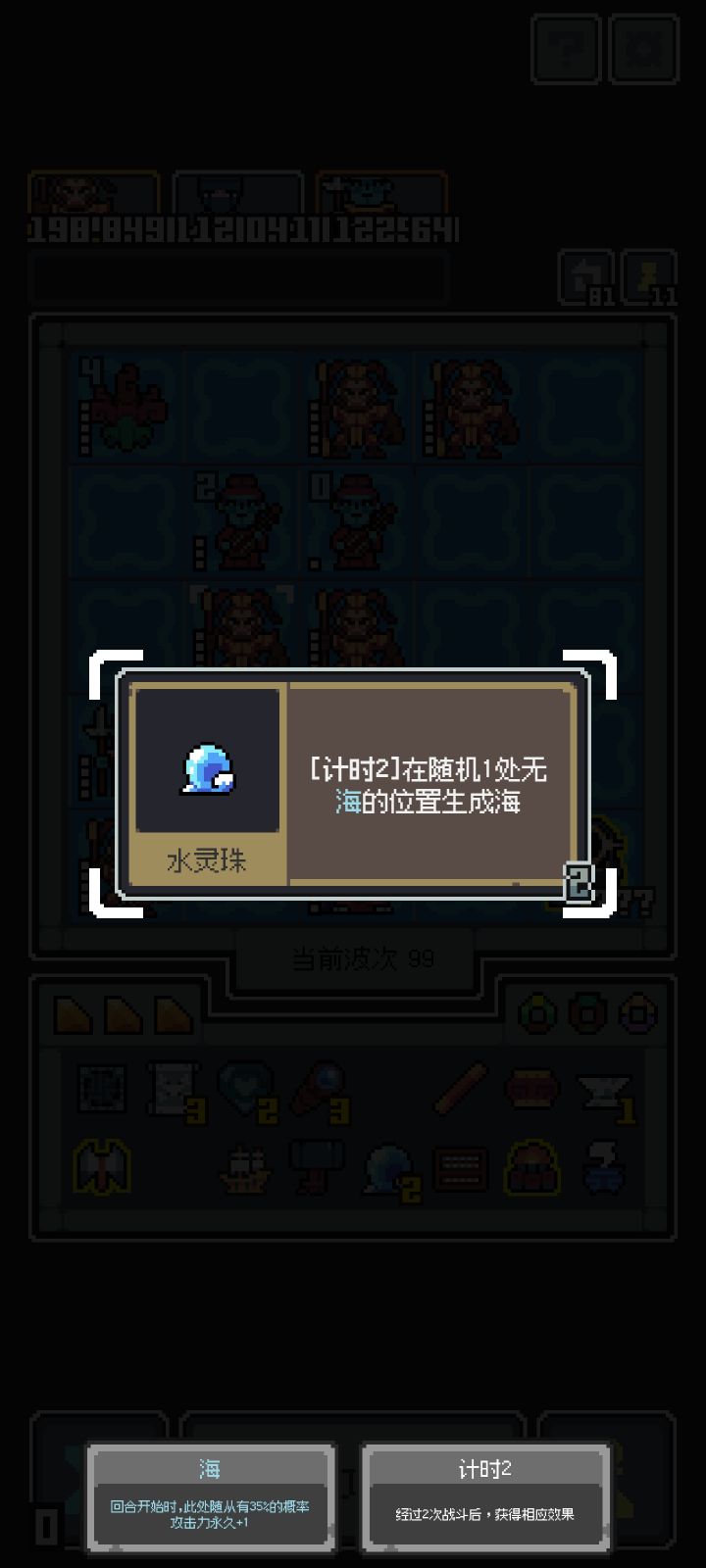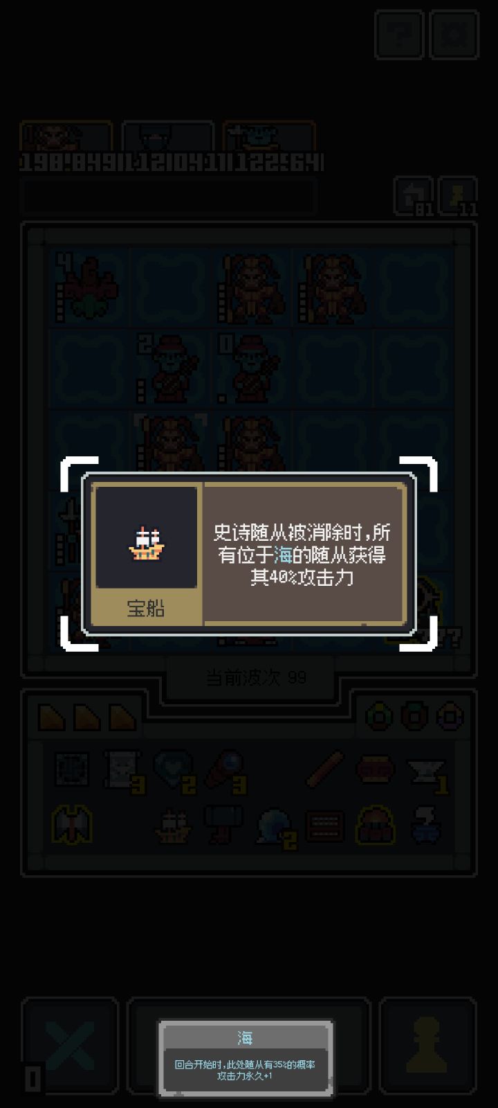 用精卫能过,得用陷阱打最后一个 boss在 99 关里面根本不可能用他起任何作用,太少了用宝船,太无脑了没有任何游戏体验(基因突变和宝船我认为让这个游戏掉了 3 个档次,用了他们后实在无聊)用其他的流派比如落星,又太弱了,最后 boss 根本不可能打得过除非用陷阱。。。这个宝物设计有缺陷建议改成每 10 个落星加 1 攻落星秒杀改成落星有概率可以重复多一次落星另外加多一个宝物,赶海: