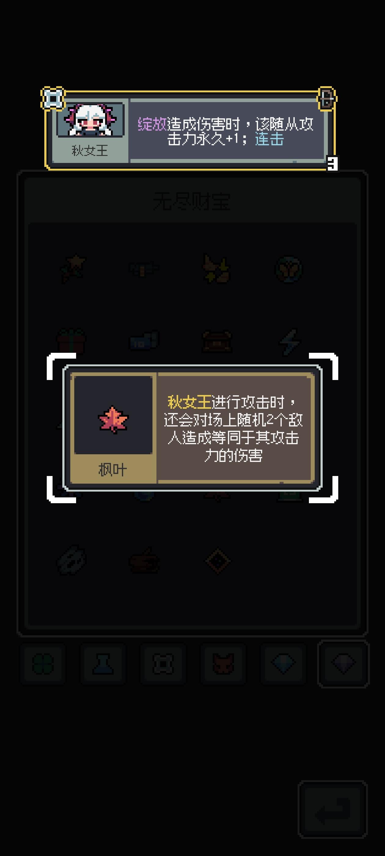 本流派数值平平无奇,但依然在全面入侵有可玩性。如图所示,该流派玩法在于使用惊骇和绽放为秋女王叠加攻击,再配合女王专属宝物枫叶🍁来达到打一下等于全打到的清场效果。前期拿魔脚,必拿专属宝物臭袜子。另外,需要注意的是,前期最好是搭配灵感和惊骇体系牌来玩,最理想情况是45层之前达成灵感和惊骇双99层,因为这两种状态每回合只掉一层,所以这个条件不是很难。当惊骇有99层之后,宝物基因窃取就可以偷到大量攻击