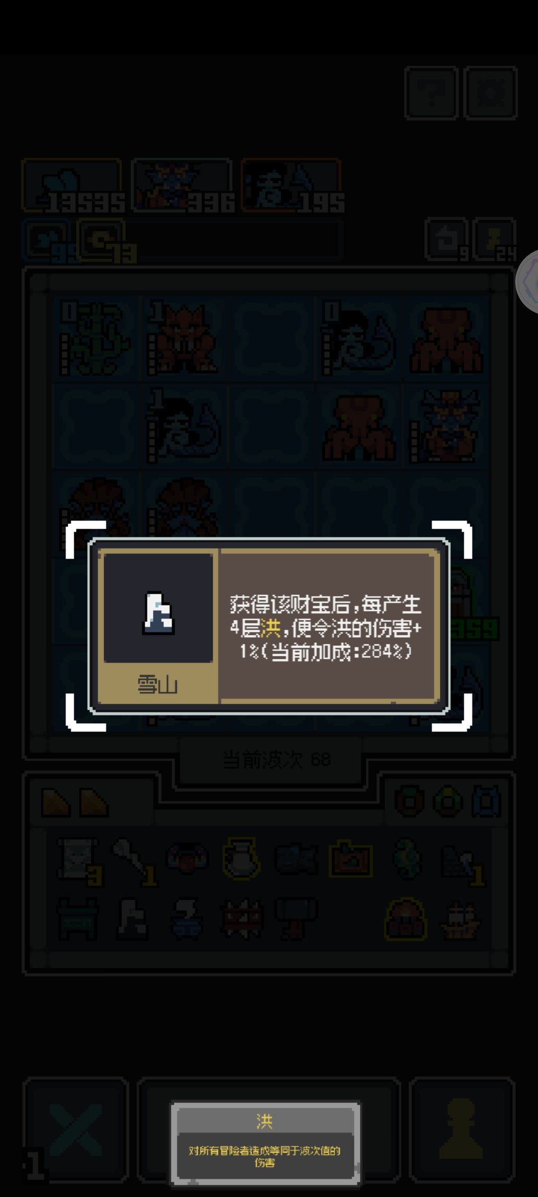 试了一下,纯用洪过关需要疯狂刷一下雪山增伤(4层洪增加1%)(前期我以为超过99层溢出的会不算,基本没刷;以及雪山出的太晚,最好一二层就拿到。不要用其他增伤和输出,只选洪,可以带一些单体输出的,因为洪是群伤,偶尔会漏怪)。 视频中我用的是洪+海龙王(已经尽可能让其攻击低一些减少输出了,因为如果你刷一个1亿或者10亿攻击的海龙王,随便用一个最低的群攻方式就能通关),(什么?你刷不到1个亿?那没事,