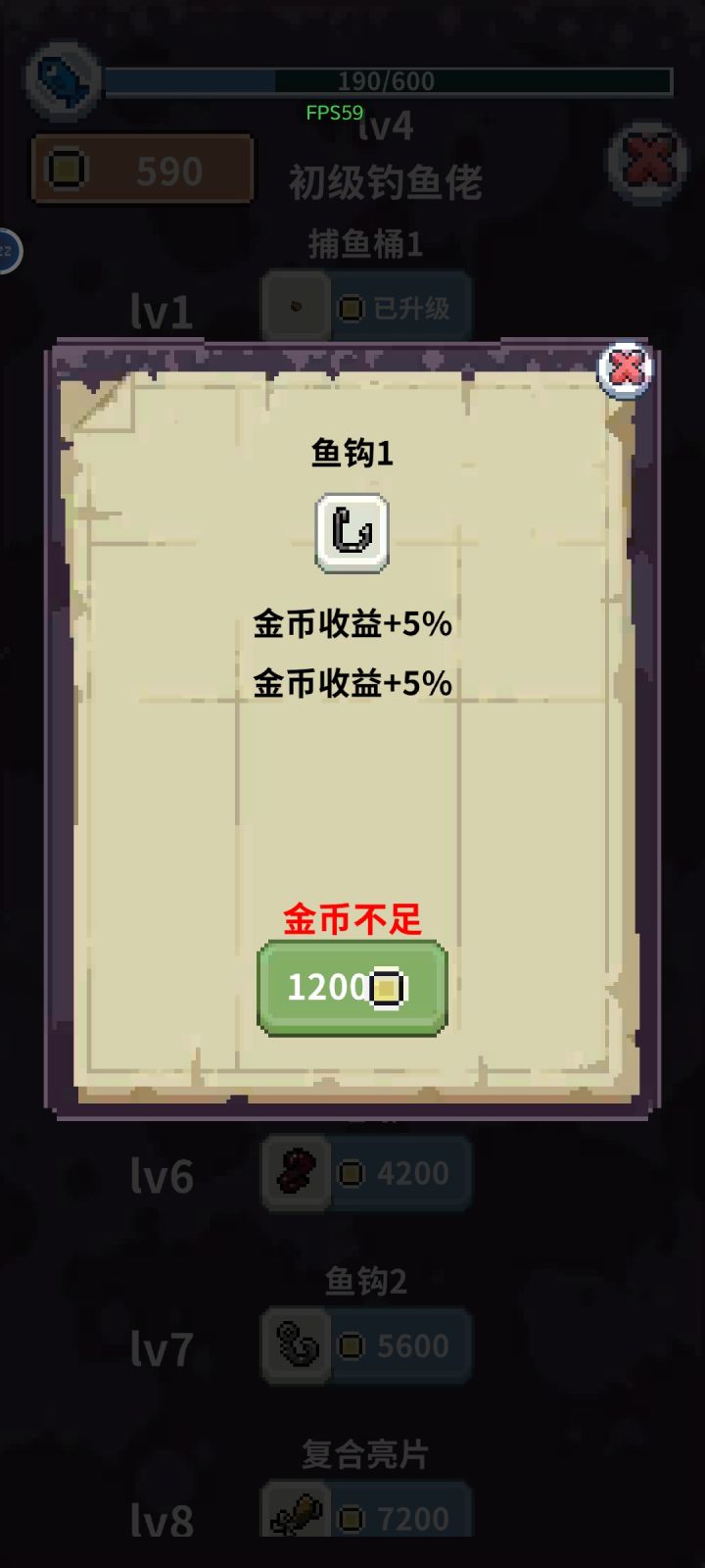 而初始七秒钟钓一条普通鱼,升级里没有缩短钓鱼时间的科技,仅有增加金币收益的科技(P1),一次增加10%,一共有10个鱼钩科技,也就是说升级满七秒钟得20金币