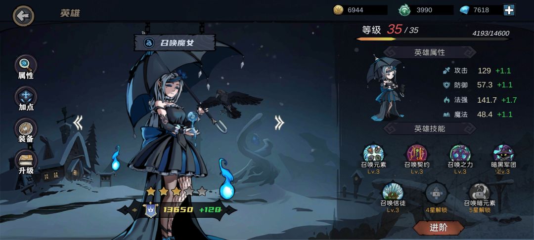 首先主英雄用召唤魔女。副英雄用美杜莎和大剑豪 1级技能都升满。美杜莎攻击提升20%+石化。大剑豪攻击两次,每次150%伤害。很实用的两个被动,被石化后怪物不会反击。 然后召唤魔女的1技能,召唤精神元素。自带魔法井,每回合回蓝15。如果你首充了6块,有个魔法龙,也有魔法井。没首充就等魔灵或者灯神。 然后重点,技能主要就是凑大召唤师和六芒星纹。 有条件可以凑一个魔法之源。 因为自带召唤精神元素,并且净