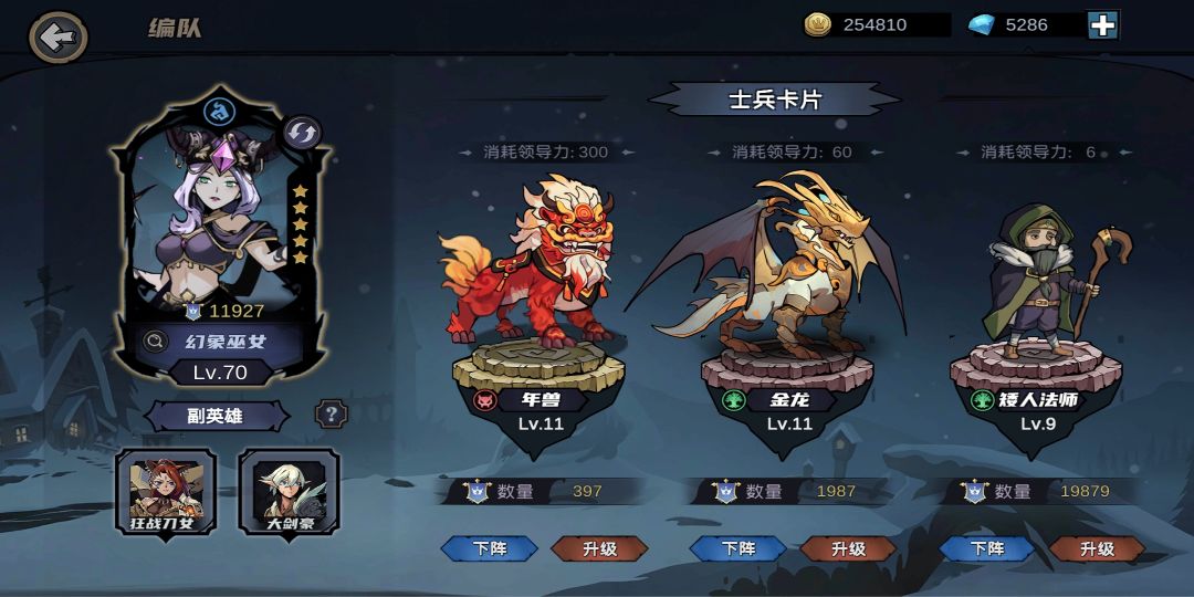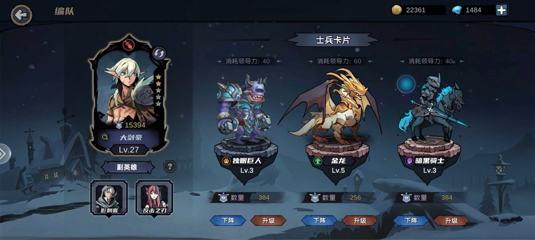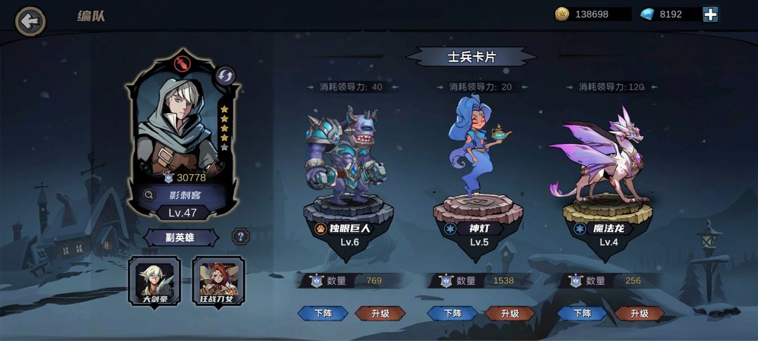 英雄搭配 前期(副英雄解锁前) :大剑豪 后期:主英雄:影刺客 副英雄:大剑豪;狂野猫女(解锁二副后)