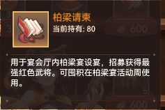 在小虾米战三国中,柏梁宴请属于常驻的轮换活动,正常活动周期为7天重置,作为游戏中玩家20资质以上武将(红色武将)重要的获取途径之一,在其当值周期内也伴随有活动礼包以供玩家选择。 红将活动周,指的是目前游戏中轮换的几个以7天为周期的活动中“可指定红色名将”的活动,活动周内通过消耗“柏梁请柬”来抽取红色名将,或者1500元宝/次抽取。100抽保底指定红色名将(非红将周则无法指定) 柏梁请柬,该道具便是