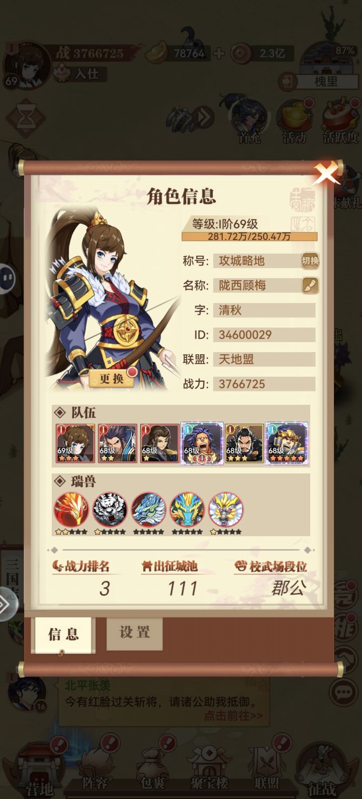 本帖用于记录小氪金魏国开荒,按天次分别公布等级提升/玩法进度/阵容配置等游戏内容阵容配置计划目标:主魏国势力+圣搭配阵容配置:主角女弓+典韦+夏侯渊+曹操+郭嘉+贾诩(计划中后期用水镜)宝物配置女主角:七星宝刀+兵书24+里飞沙典韦:李广弓+吞天麒麟甲+照夜玉狮子夏侯渊:丈八蛇矛+紫金狻猊甲+燎原火曹操:双铁戟+木牛流马+惊帆郭嘉:斩蛟剑+八阵图+灰影水镜:驭风剑翎扇+仇国论/