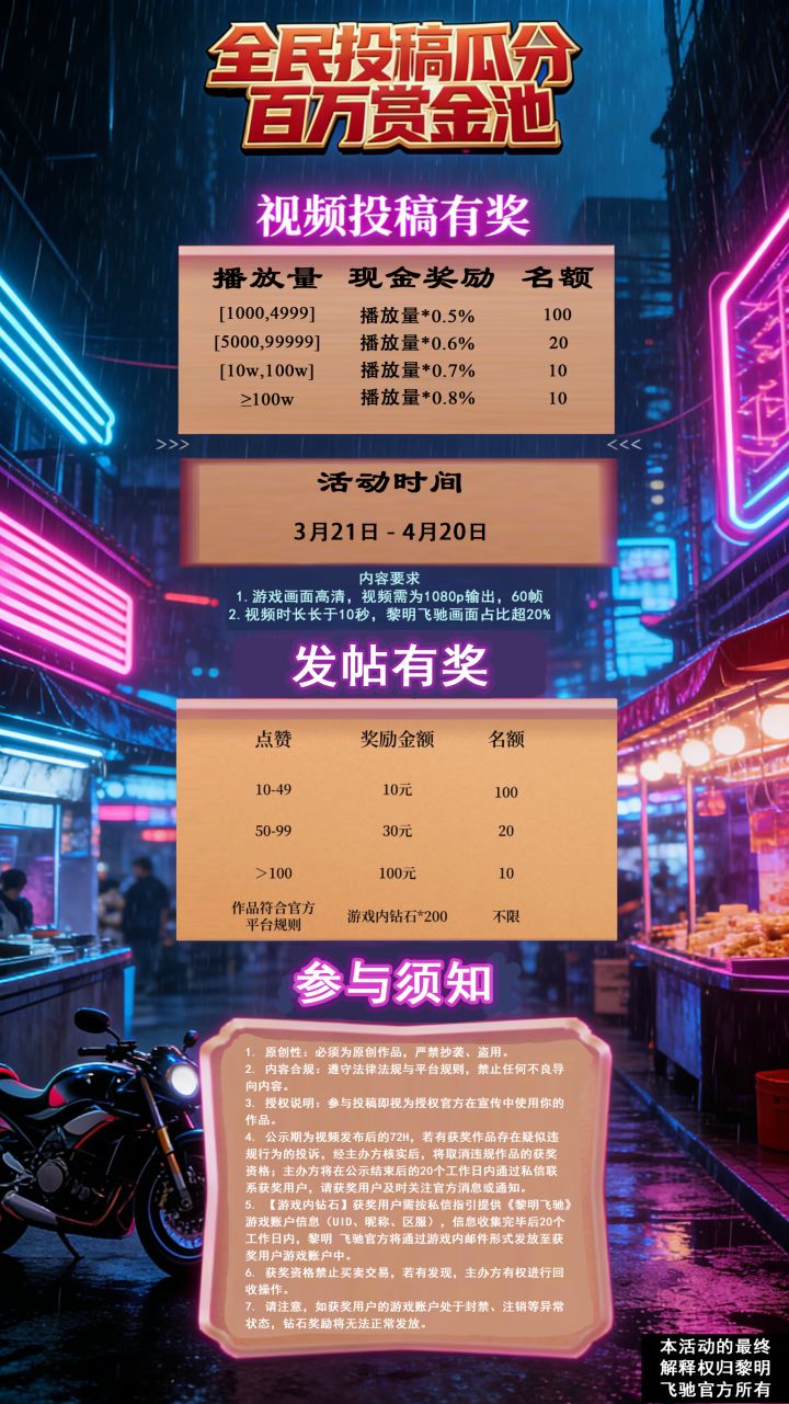 全民投稿瓜分百万赏金池,赢超多游戏好礼 !车手们,是时候展现真正的技术了!不止于赛道上的疾驰,《黎明飞驰》的世界更需要你的无限创意。1月20日-3月20日期间,创作与《黎明飞驰》手游相关的评测、攻略等作品,即可瓜分百万现金奖励,还可获得游戏内钻石和限量实物纪念品!填写报名表即可参赛:https://ccnmm2ft9l87.feishu.cn/share/base/form/shrcn12