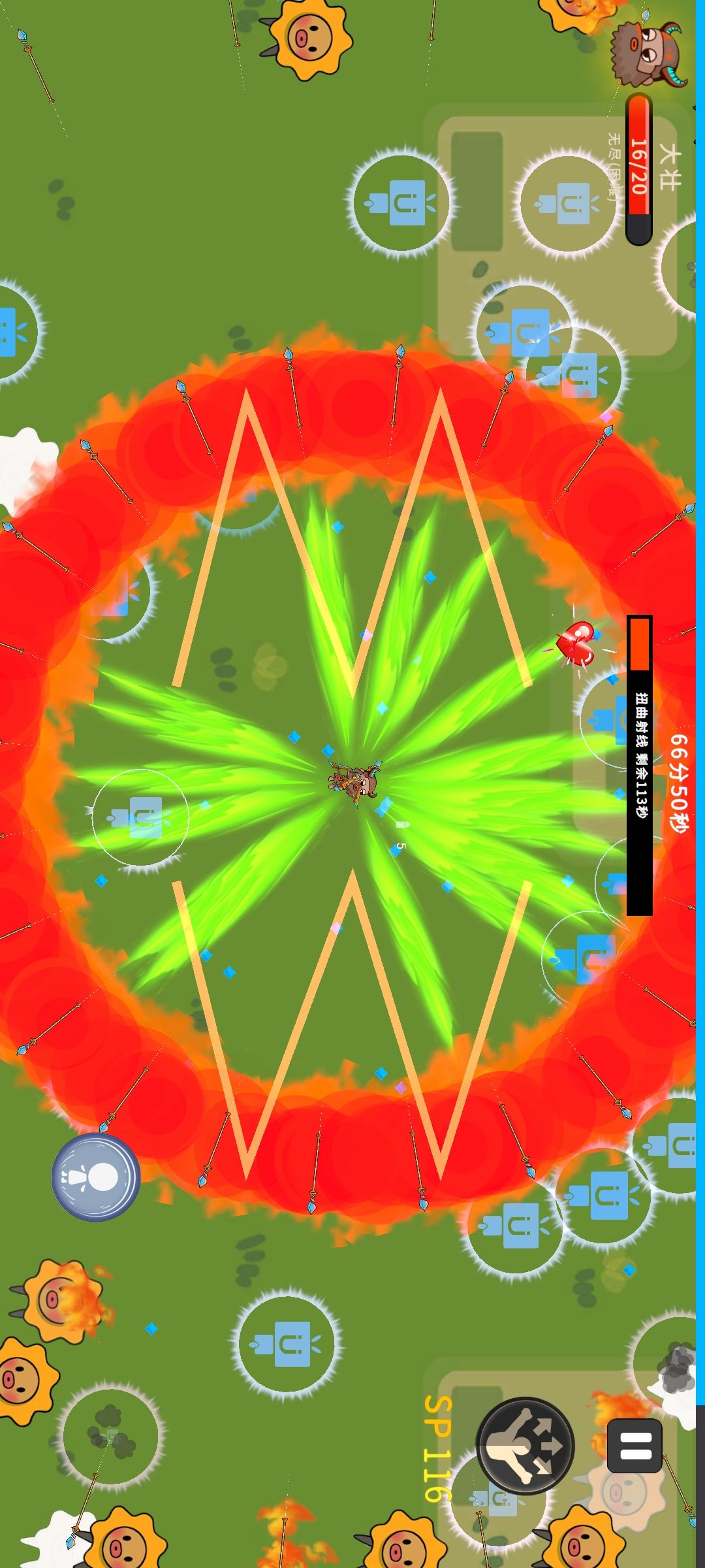 这个火圈刷到上下左右全覆盖了小怪出来就死,技能之所以这么配置就是怕卡屏,这样玩了150多分钟不卡,站撸双射线死不了最后放弃了,其实技能可以不用激光和蜜蜂的空着就行,前期击中位弄个大西瓜过度一下升满后换经验拾取器就行了,火球🔥插件用冰冻或者诅咒,蘑菇🍄用诅咒或者回血比较随意不重要