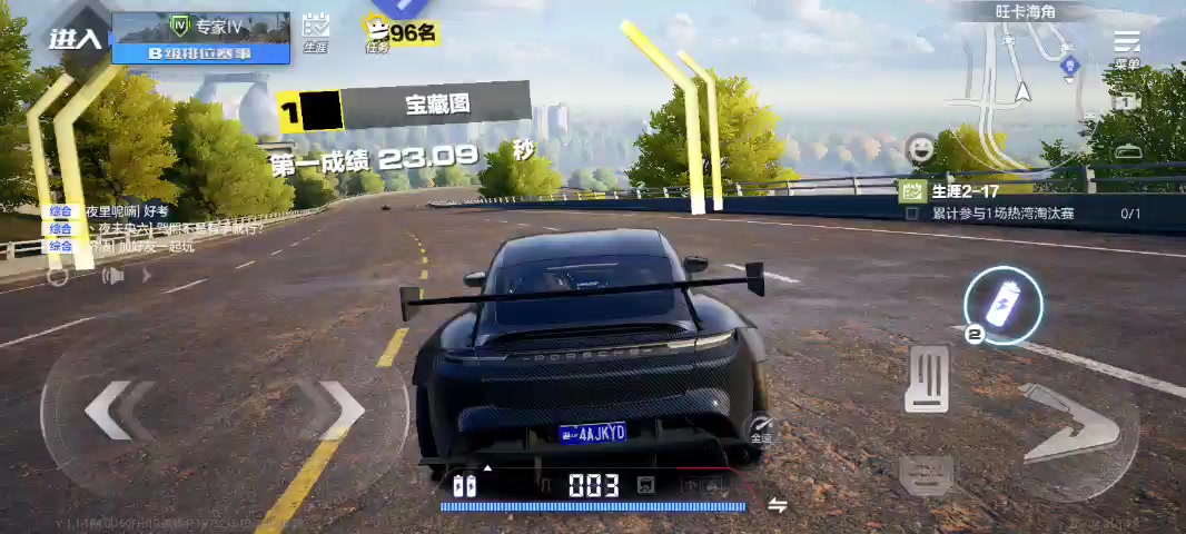 试了三四个小时,终于成功了,保时捷TTS 精英级性能,成功以24.76秒的成绩进入广东省第66名。 (地点旺卡海角左下角的全速过弯)