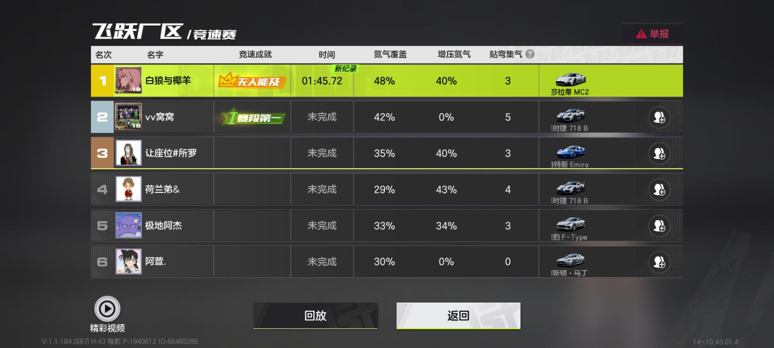 我的游戏ID是那个白狼与椰羊,这一把我是全程领先的,没被超过一次,但是我领跑的时候上面就显示我是第六名,已经反馈了,不知道什么时候能解决。这个bug太影响游戏平衡了,赛段第一居然是那个一直在我后头的第二名,我有一个符合这个排名的视频,也是在回放里面看到的,我当时以为是网比较卡,但是后来一看排名居然对上来了。但是我重新看了一下回放,这个卡顿又没有了