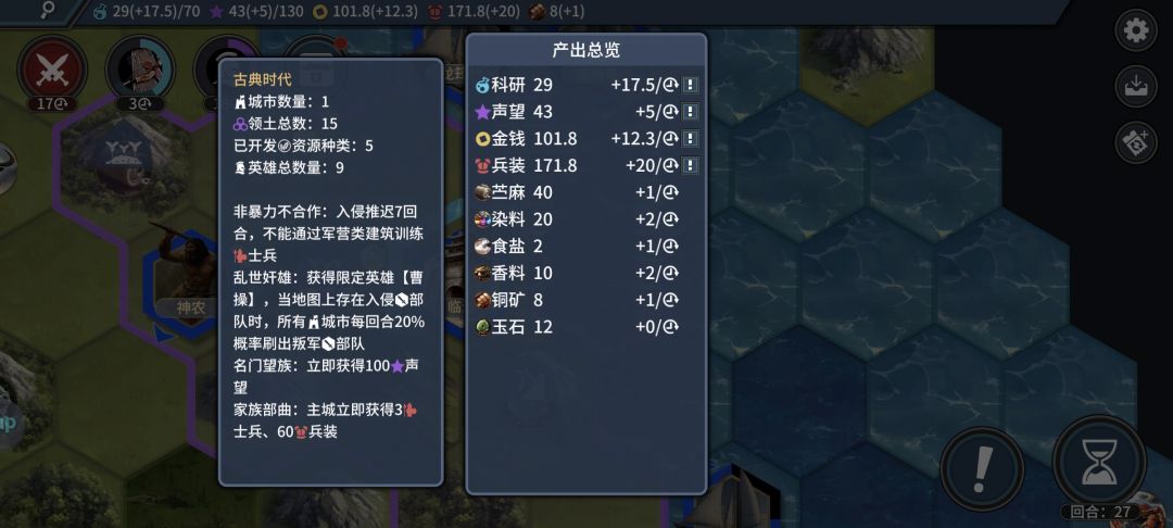 感谢官方刷新劵。 用的无尽参赛图,也就过了第一波,既然官方给了券,那就继续玩下去。发布思考及游戏记录,活跃游戏。 君主征服者,特性选择入侵推迟7回合,曹操,100声望,家族部曲。 虽然无尽模式,但目的地还是放到科技胜利或过甘地。 大的思路是第一波硬抗,配合刷新劵最好跨海。第二波来之前,抢先把副城开到南北极并刷出诸葛亮放主城。后面是主城专心发展经济,副城专职战斗,资源随缘。 因为本局是征服者,会有大