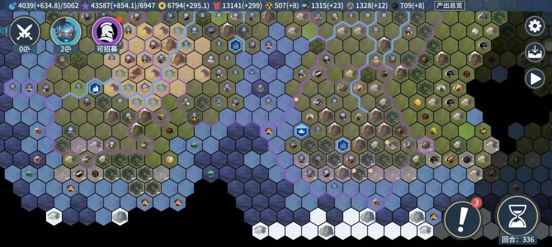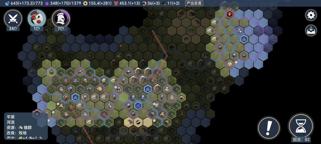 基础知识 产能:也称锤子,城市建造建筑需要产能,产能越高建造所需回合数越少,可以通过英雄技能、改良地块、城市建筑等增加产能 科研:解锁科技需要科研,科研越高解锁速度越快,可以通过英雄技能、改良地块、城市建筑等增加科研 金币:城市改造地形,英雄增加属性,士兵军饷,英雄俸禄,都需要花费金币,金币负收入将减少科研 士兵:建造兵营类建筑可以将人口训练为士兵,一些英雄技能也可以转化士兵,君主技能征服者可以消